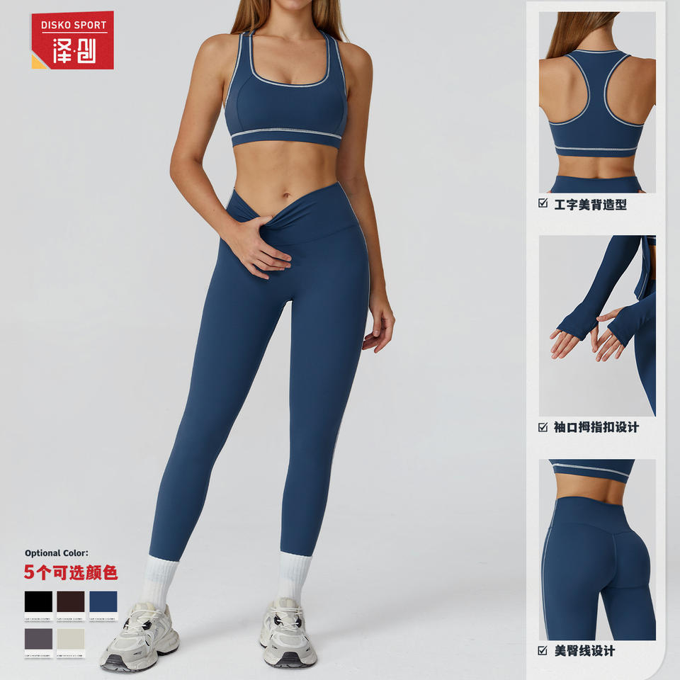 ชุดโยคะดิสโก้สปอร์ต 2 ชิ้น คอวี แต่งขอบตัดสี ชุดออกกำลังกายสำหรับผู้หญิง วิ่ง ฟิตเนส ชุดกีฬา