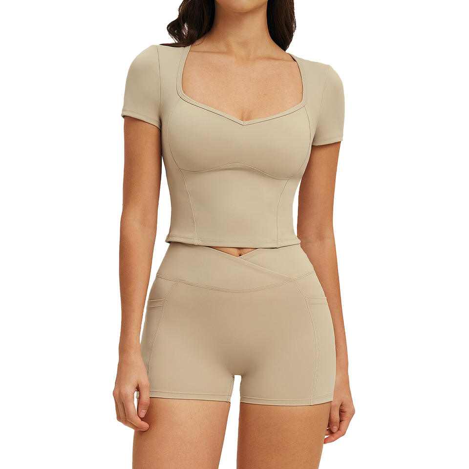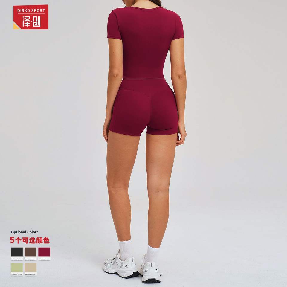 ชุดโยคะดิสโก้สปอร์ต เสื้อครอปคอเหลี่ยมเอวสูง แขนสั้น ซับเหงื่อ ระบายอากาศ แห้งเร็ว ยืดได้สี่ทิศทาง