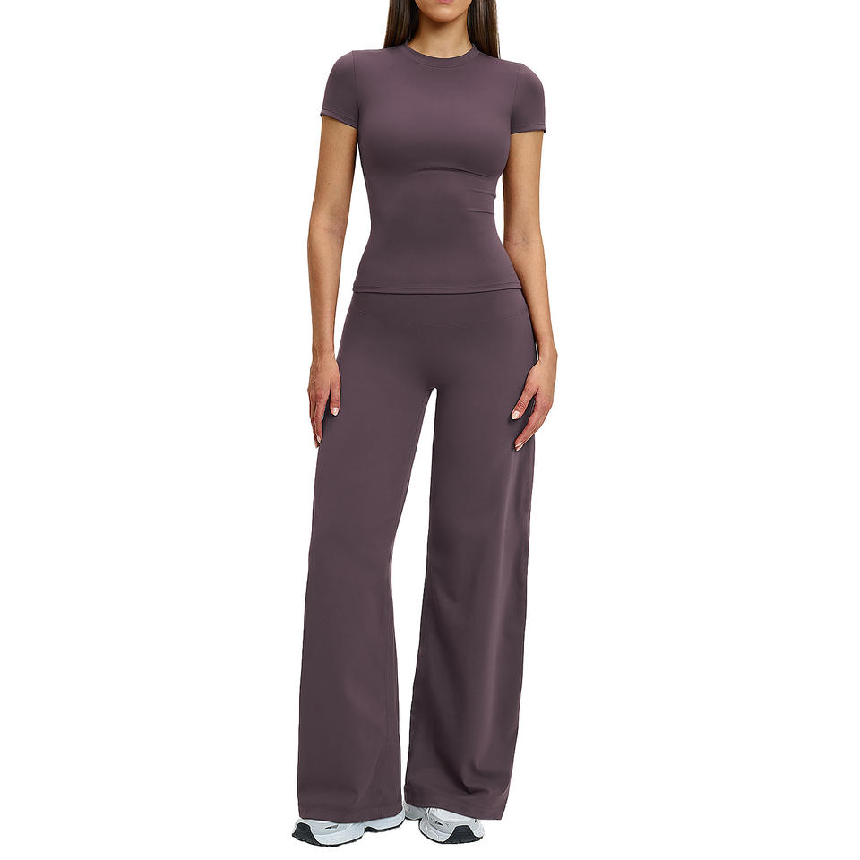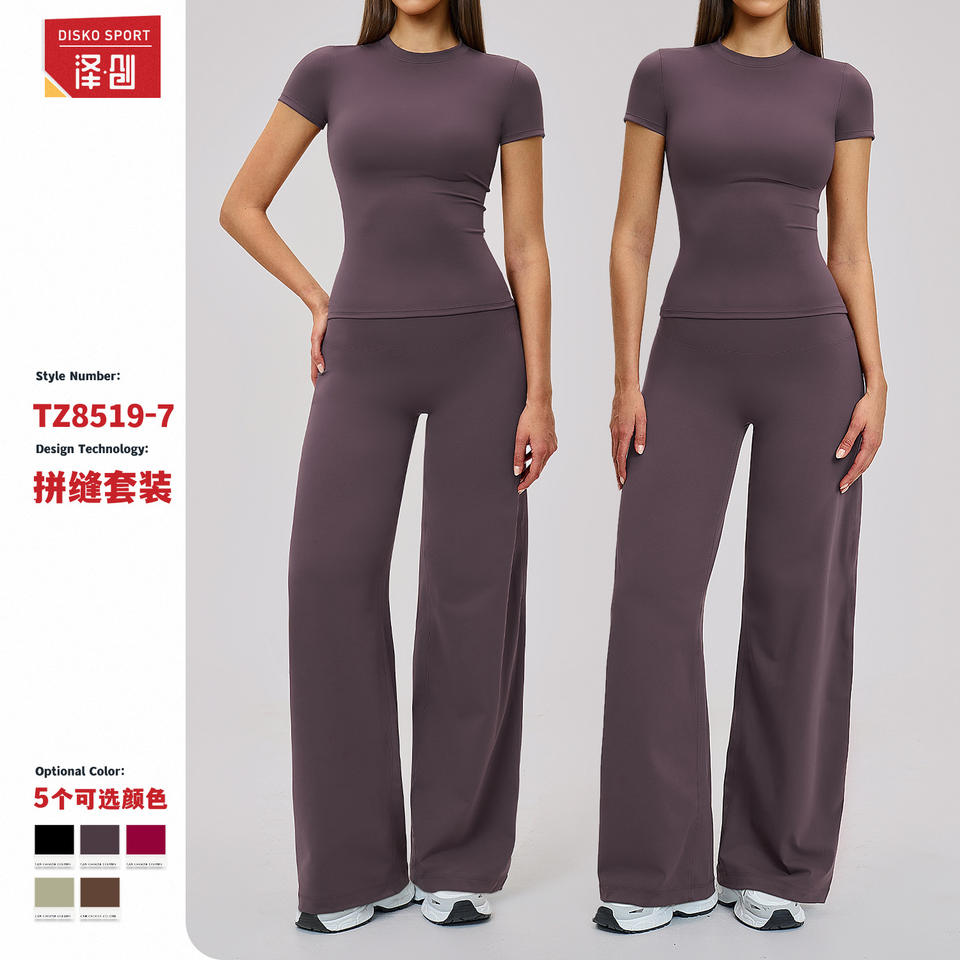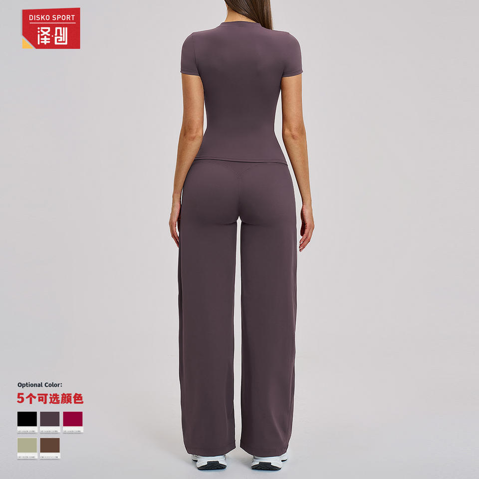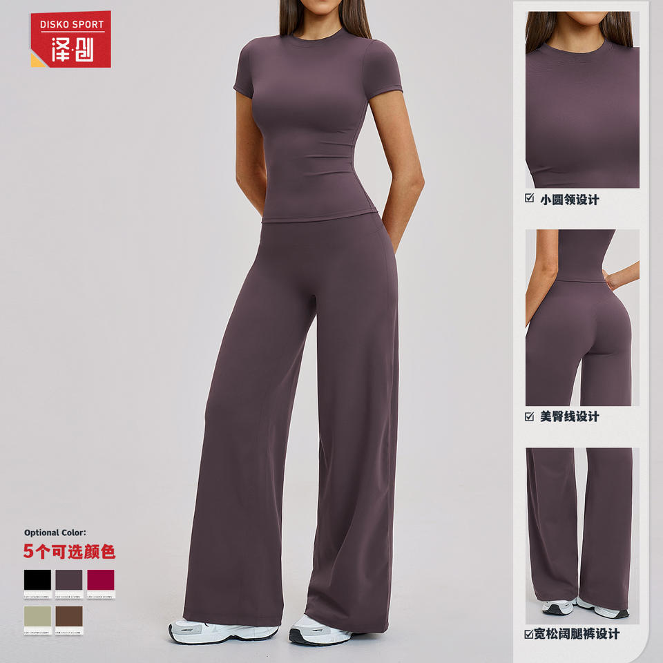 ชุดโยคะดิสโก้สปอร์ต เสื้อแขนสั้นคอกลมเอวสูง ผ้าสี่ทิศทางยืดได้ ตกแต่งด้วยตะเข็บตัดกัน ชุดออกกำลังกายสำหรับผู้หญิง