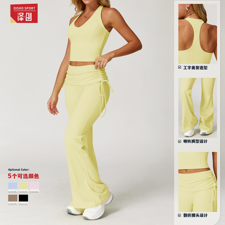 ดิสโก้ สปอร์ต โยคะ เซ็ตเสื้อครอปผู้หญิง เสื้อครอปเอวสูง กางเกงสองชิ้น ชุดออกกำลังกายสีทึบ TZ3055