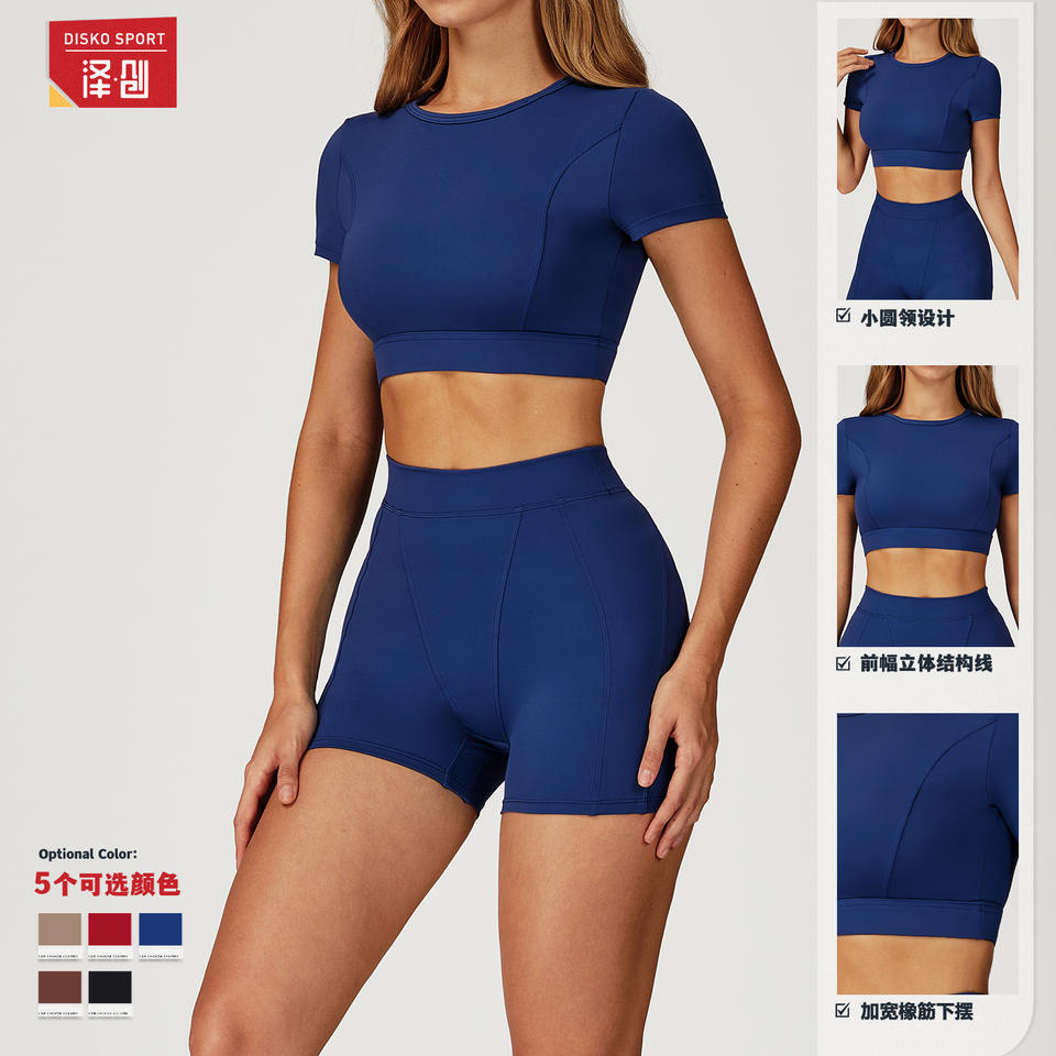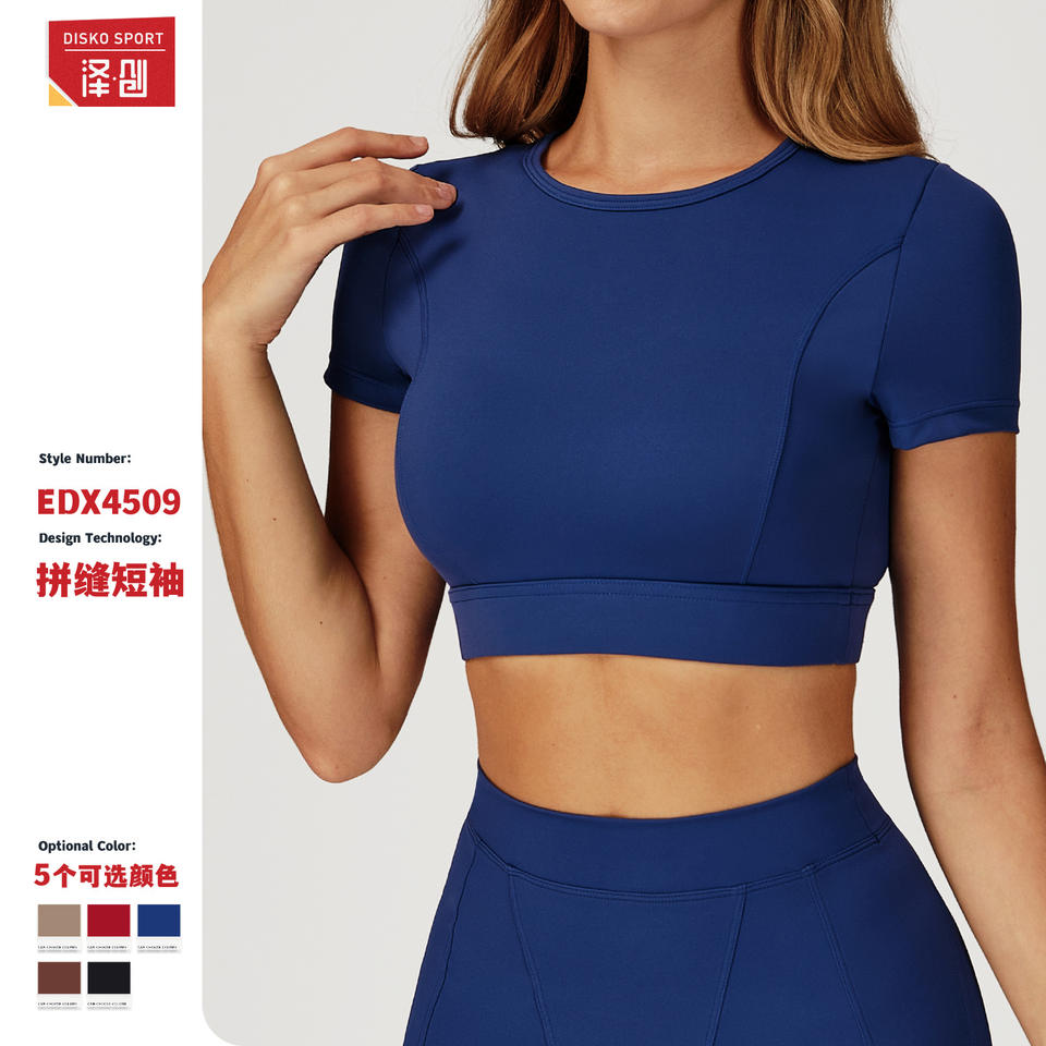 ดิสโก้ สปอร์ต โยคะ ท็อปเสื้อครอปคอกลมแขนสั้นสีทึบความยืดหยุ่นสูงออกกำลังกายฟิตเนสเสื้อผ้าสตรี EDX4509
