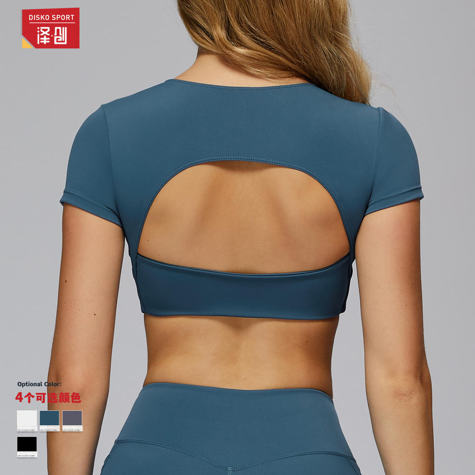 เสื้อยืดออกกำลังกายสำหรับผู้หญิง ดิสโก้ สปอร์ต โยคะ ท็อป แขนสั้น คอวี โชว์หลัง รุ่นพรีเมียม สีดำ กรมท่า เทาควันบุหรี่ ขาว