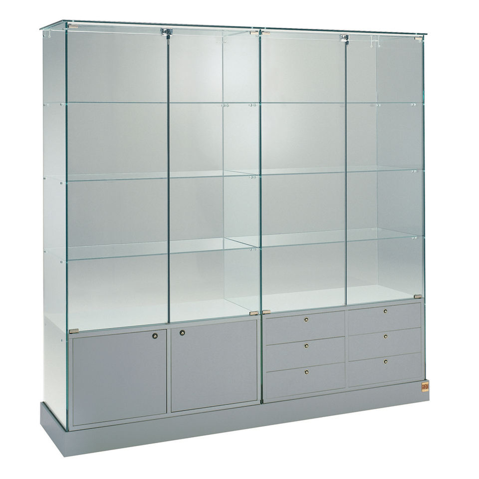 Display Cabinet 185Cm Wide 180Cm High Light Grey Tempered Glass Doors With Shelves And Drawers