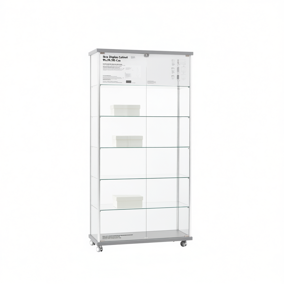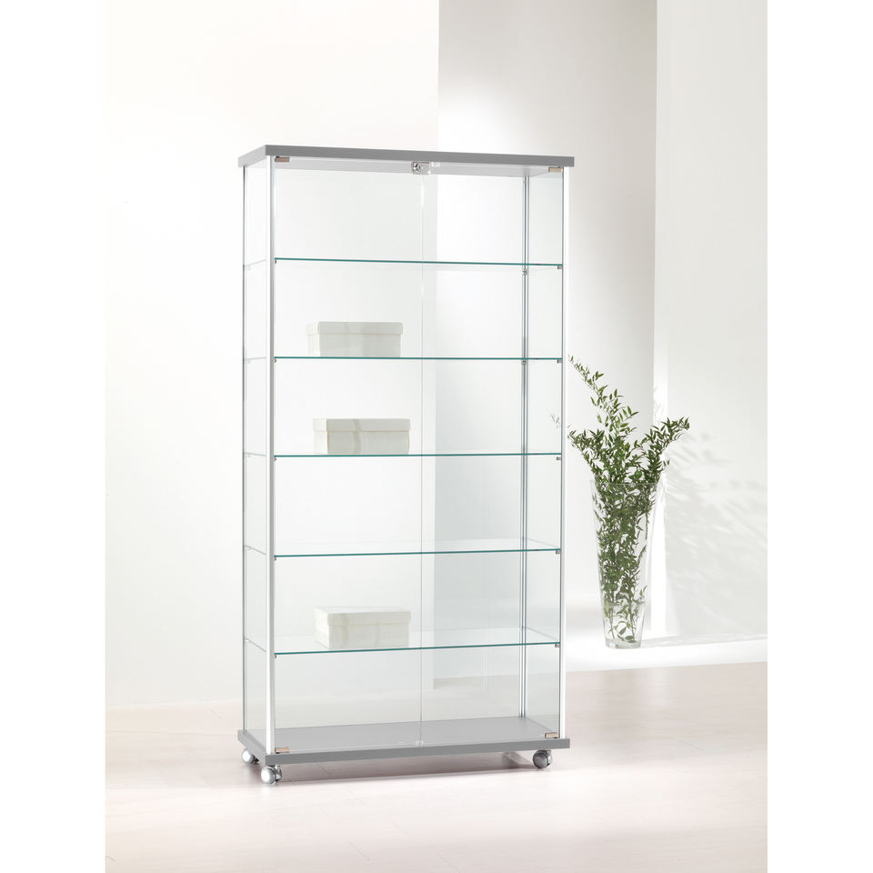 ตู้โชว์ 95x39x185 ซม. ประตูกระจกสีเทาอ่อน ชั้นวางปรับระดับได้ ฐานล้อเลื่อน