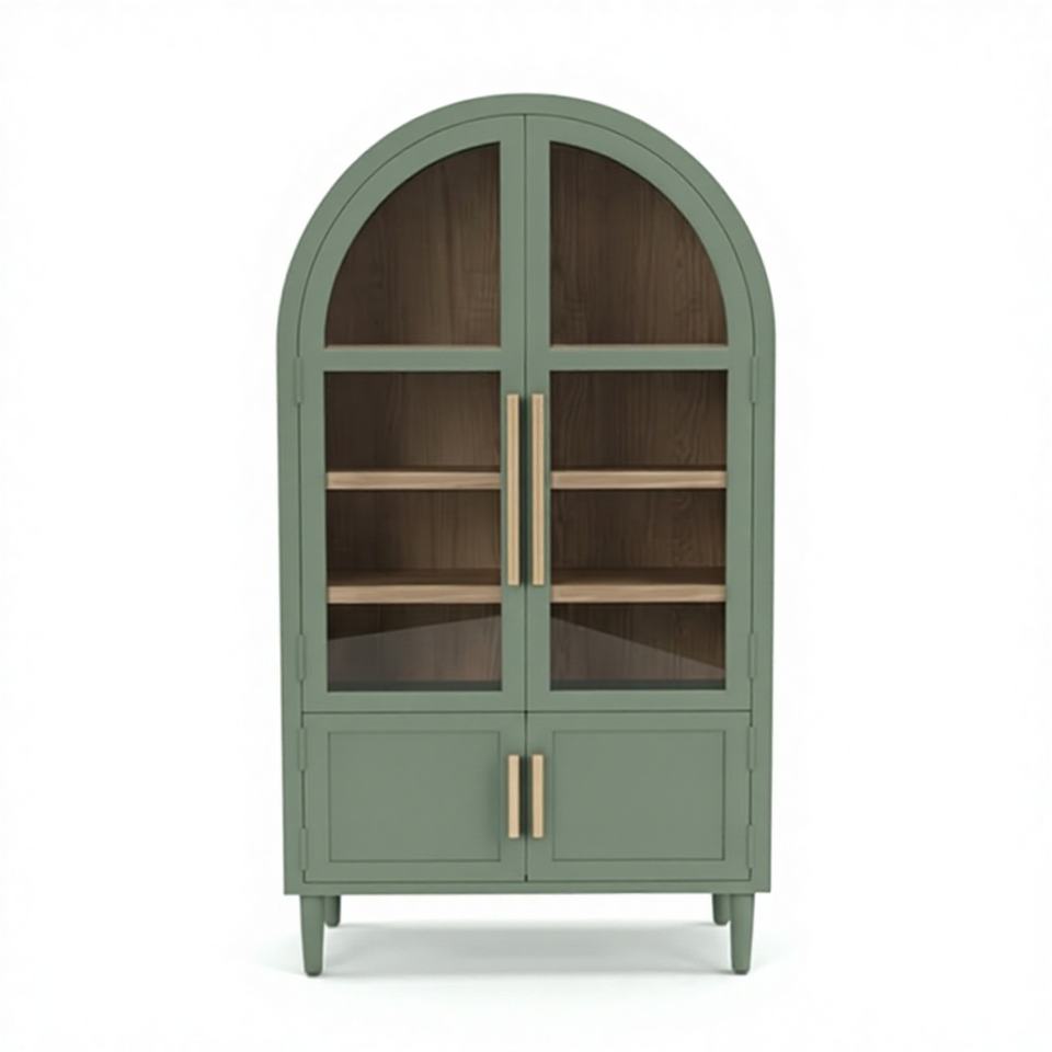 ตู้โชว์โค้งไม้ยางพารา MDF ปิดผิวโอ๊ควีเนียร์ เป็นมิตรกับสิ่งแวดล้อม 4 ช่อง บานประตูแบบ Shutter สำหรับห้องนั่งเล่น เฟอร์นิเจอร์บ้านสไตล์โมเดิร์น