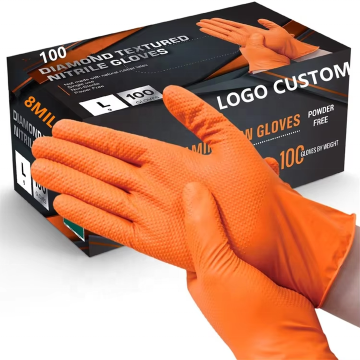 ถุงมือไนไตรล์ทางอุตสาหกรรม9นิ้วมีที่จับพื้นผิวเป็นเพชรสีดำสีส้มขนาด8ล้านแบบใช้แล้วทิ้งทนทานทนทานผ่านการรับรอง EN455