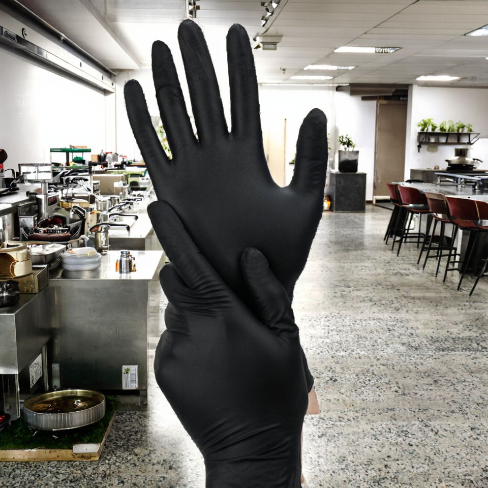 ถุงมือไนไตรล์สีดำแบบใช้แล้วทิ้ง หนา 3 มิล ปราศจากแป้ง ปราศจากซิลิโคน ปราศจากน้ำยาง สำหรับทำอาหารในครัว แปรรูปอาหาร และเครื่องจักร