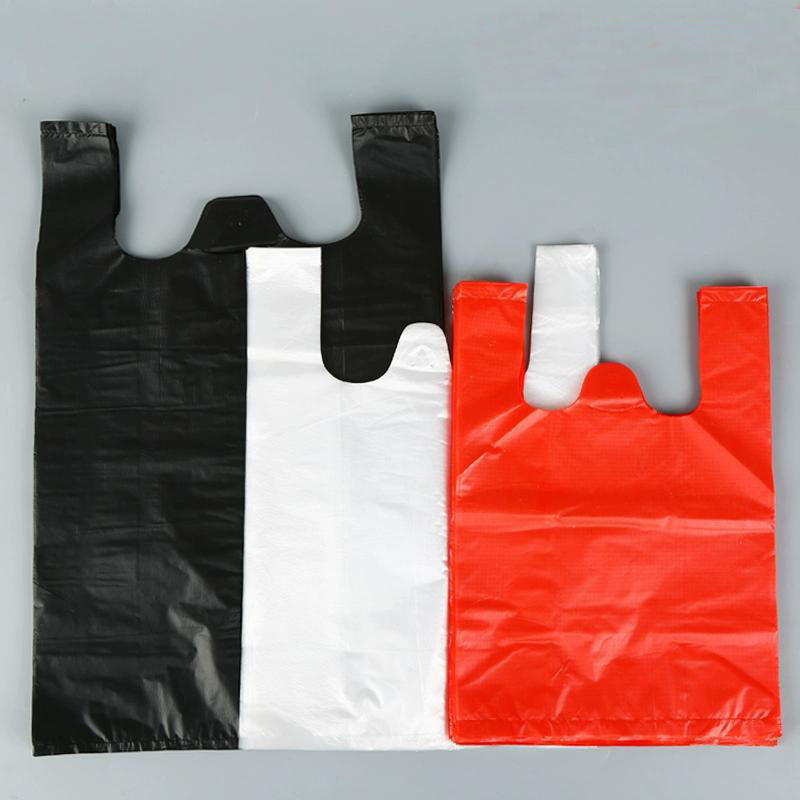 ถุงช้อปปิ้งแบบเสื้อยืดสีดำ ผลิตจากพลาสติกรีไซเคิล PE ใช้แล้วทิ้ง ขนาดตามสั่ง สำหรับซูเปอร์มาร์เก็ต งานแสดงสินค้า ร้านขายของชำ และร้านค้าปลีก