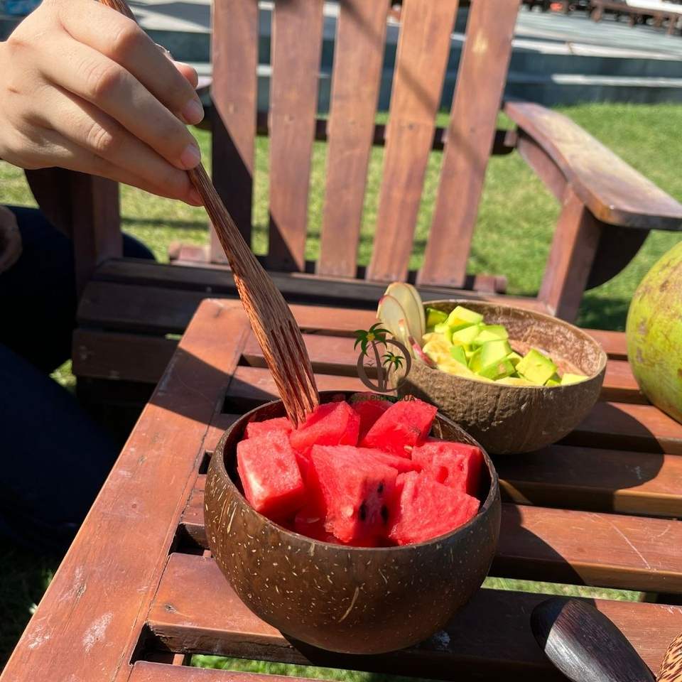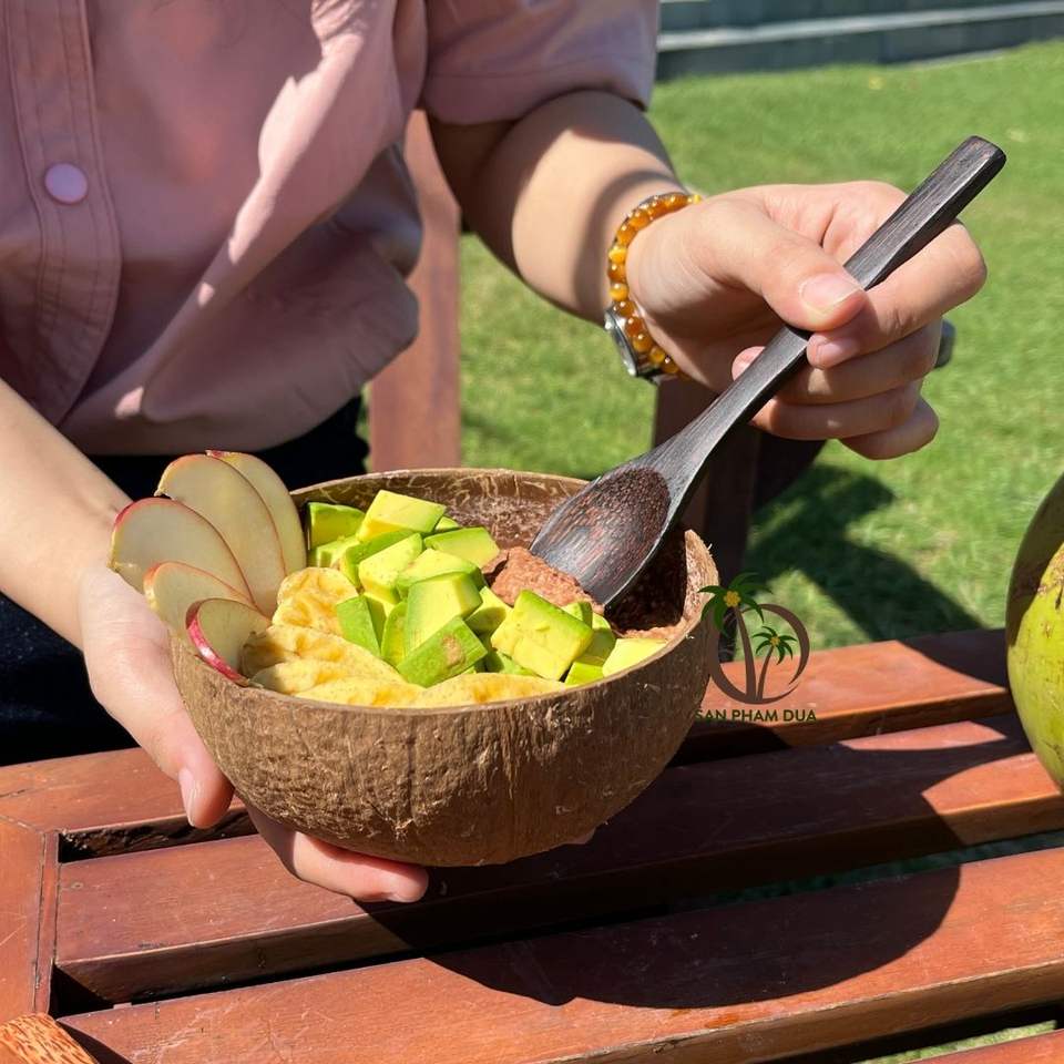 ชุดชามกะลามะพร้าวแบบใช้แล้วทิ้งพร้อมช้อน-เป็นมิตรกับสิ่งแวดล้อม น้ำหนักเบา-ดีไซน์โบฮีเมียนสำหรับแคมป์ปิ้ง-รับทำโลโก้ตามสั่ง-ขนาด 12-13 ซม.