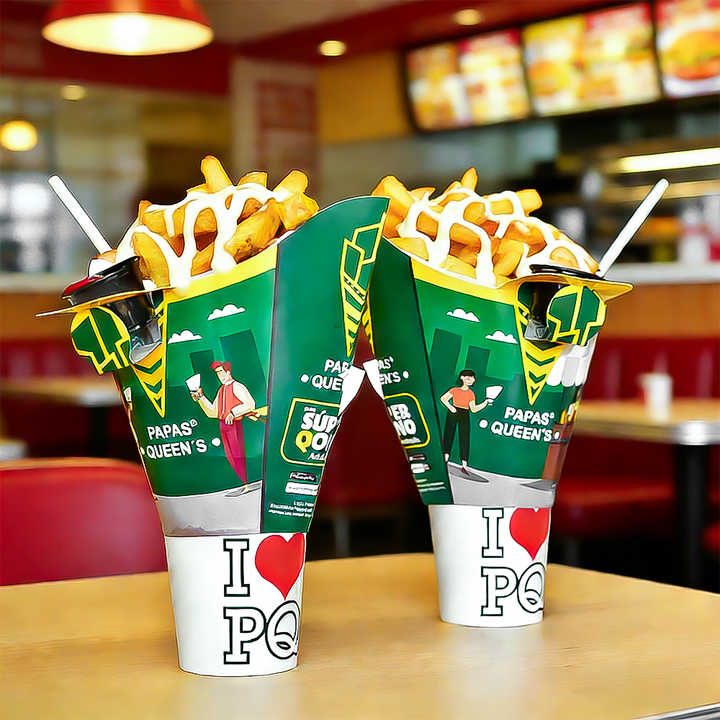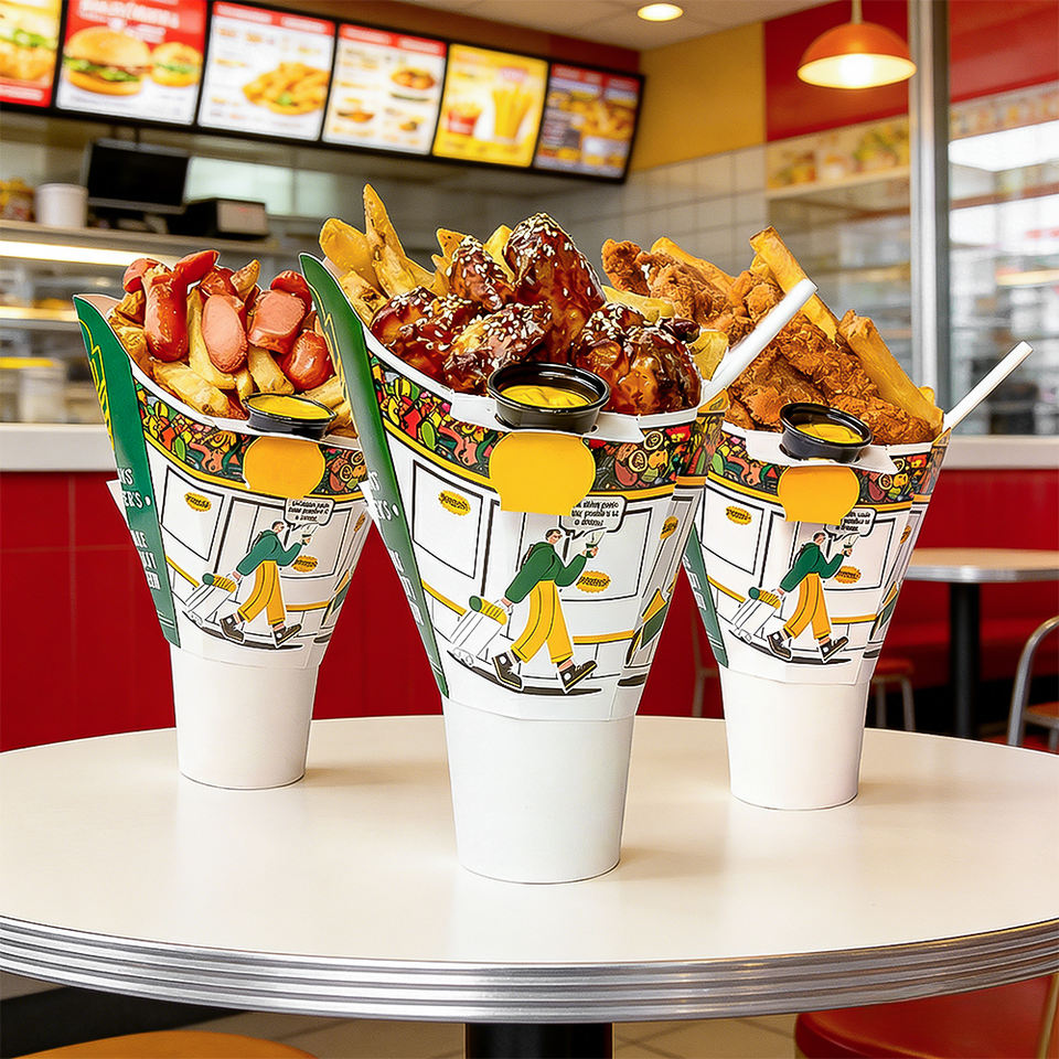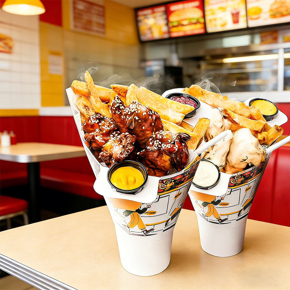 ภาชนะใส่อาหารแบบใช้แล้วทิ้งขายส่ง กล่องใส่ขนมปาปาสเคบับ ถ้วยกระดาษใส่เฟรนช์ฟรายส์ 2 in 1 ถ้วยกระดาษสำหรับไก่ทอดและเครื่องดื่ม