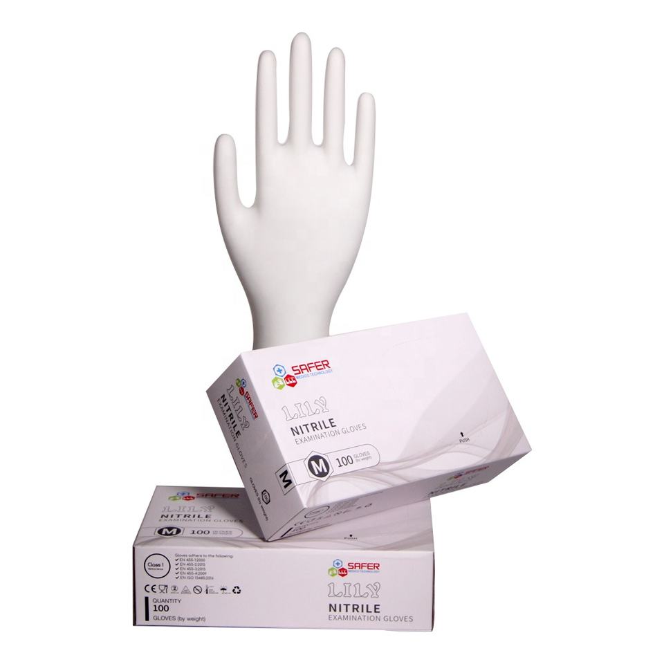 ถุงมือไนไตรล์แบบใช้แล้วทิ้งถุงมือไนไตรล์สีขาวปราศจากผงยางสำหรับการตรวจทางการแพทย์