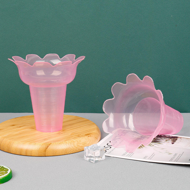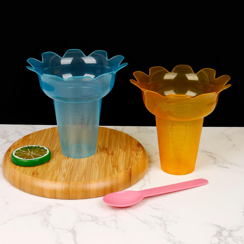 ถ้วยไอศกรีมโยเกิร์ตแบบใช้แล้วทิ้ง PP รูปทรงดอกไม้สไตล์ไทย พลาสติก ความจุ 300 มล. 450 มล. ตะกร้าเสิร์ฟอาหารน้ำแข็งไส