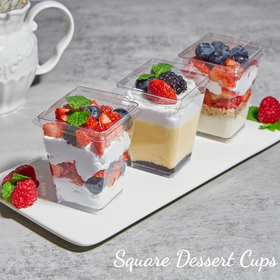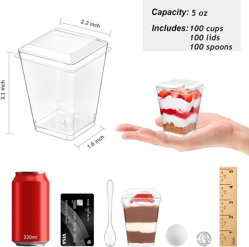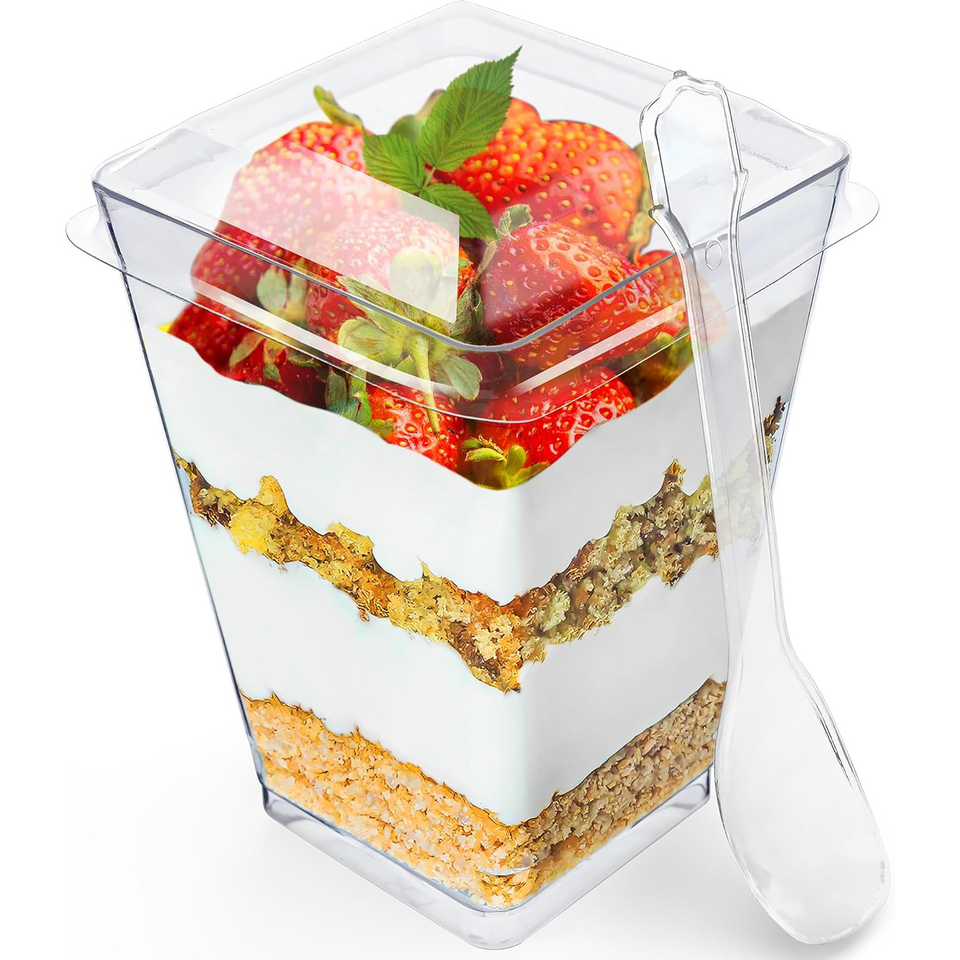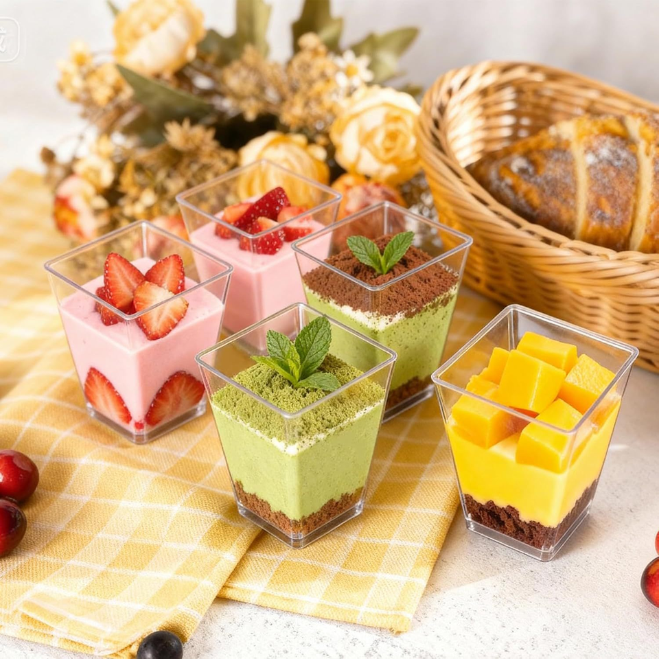 ถ้วยพลาสติก PS ใสแบบใช้แล้วทิ้ง สี่ด้าน สำหรับใส่ของหวานและไอศกรีม พร้อมฝาปิด สำหรับร้านเค้ก กาแฟ และของหวาน