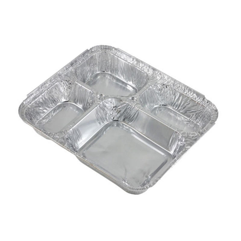 กล่องอาหารอะลูมิเนียมฟอยล์แบบใช้แล้วทิ้ง รูปทรงสี่เหลี่ยมผืนผ้า ขนาด 24.3x24.3x4.3 ซม. 4 ช่อง ความจุ 900 มล. สำหรับใส่อาหารกลับบ้าน/อาหารกลางวัน