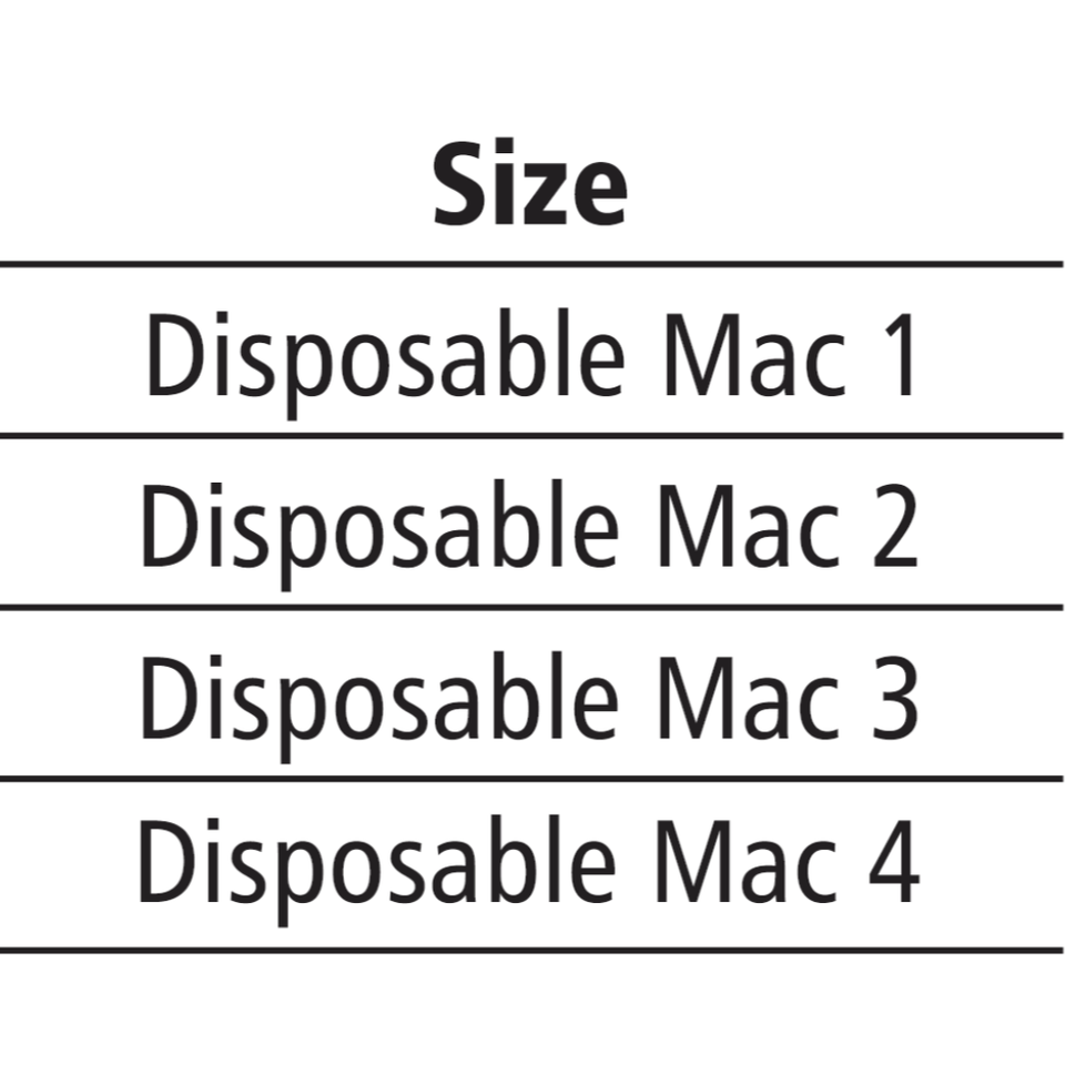 ขนาด:แมคใช้แล้วทิ้ง 1, แมค 2 แบบใช้แล้วทิ้ง, แมค 3 แบบใช้แล้วทิ้ง, แมค 4 แบบใช้แล้วทิ้ง
