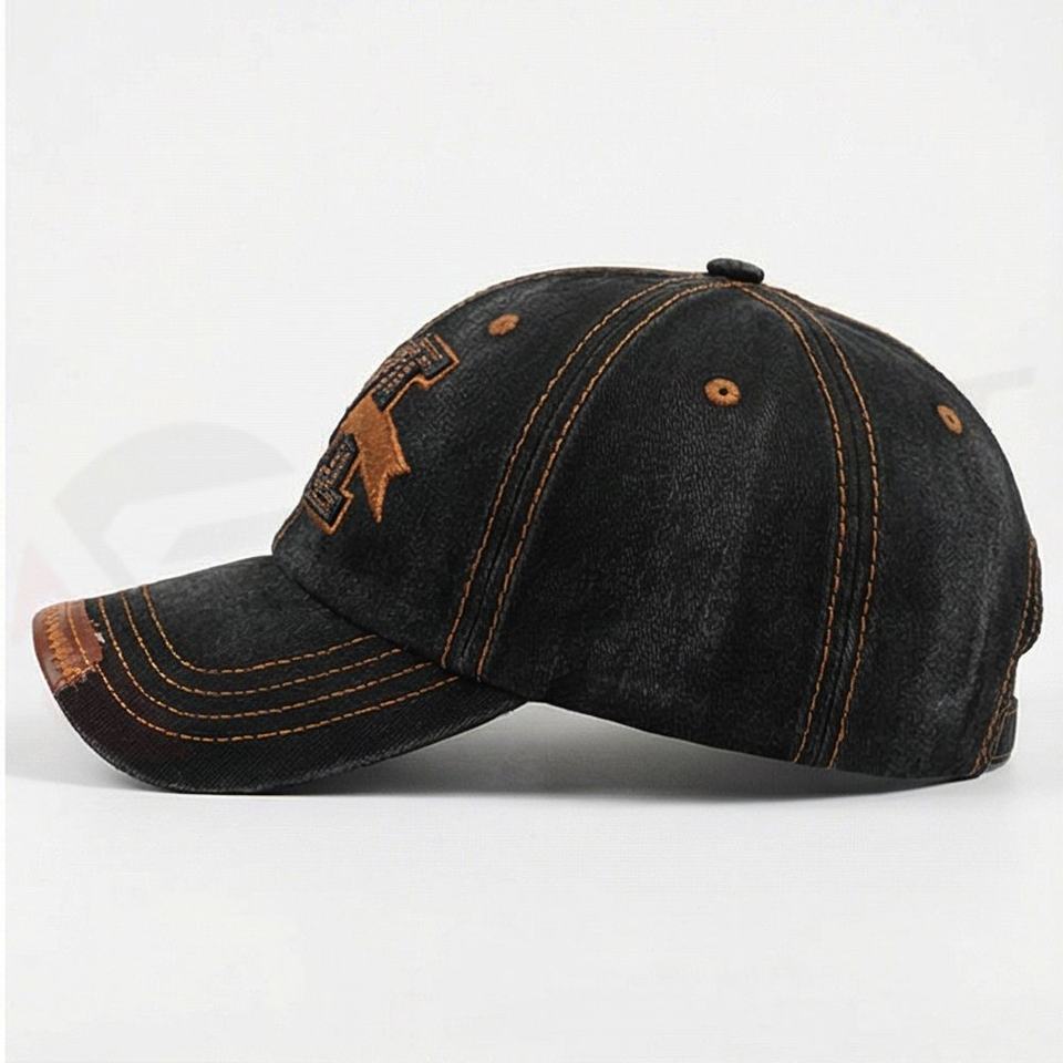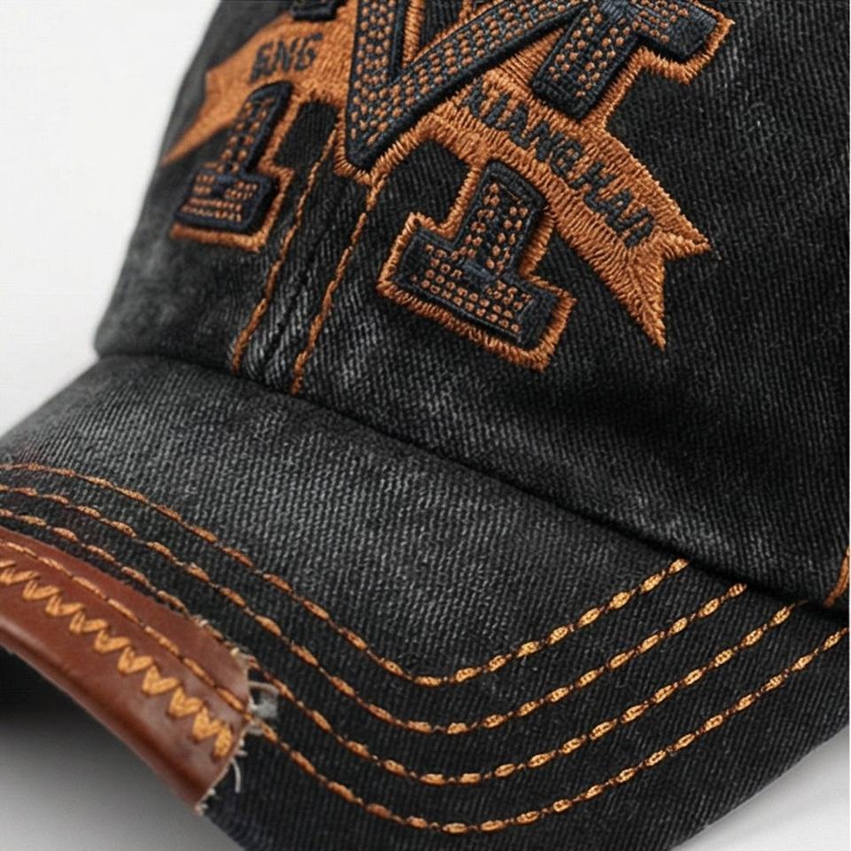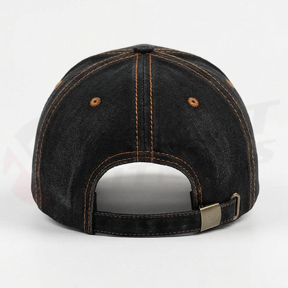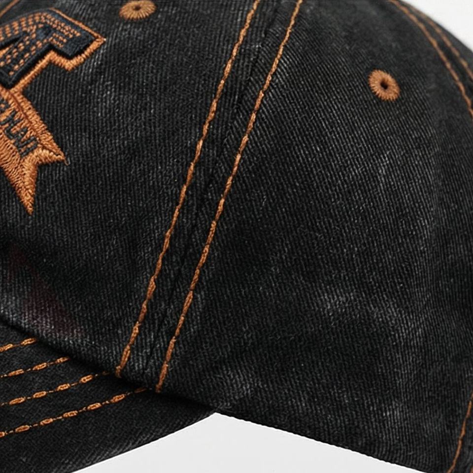 หมวกเดนิมสีดำแบบดิสเทรส แต่งลายปักอักษรภาษาอังกฤษสีส้ม ดีไซน์ทันสมัย สวมใส่สบายระดับพรีเมียม สไตล์โดดเด่นไม่ซ้ำใคร