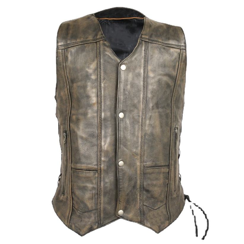 Distressed Brown Naked Cowhide Canvas Motorcycle Vest Ten-Pocket System Anti-Wrinkle Quick Dry Breathable Antique Snaps Leather