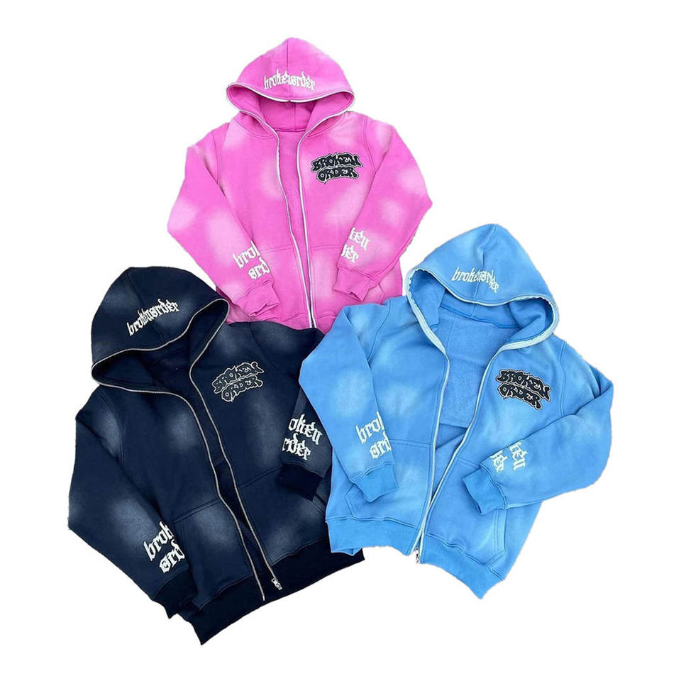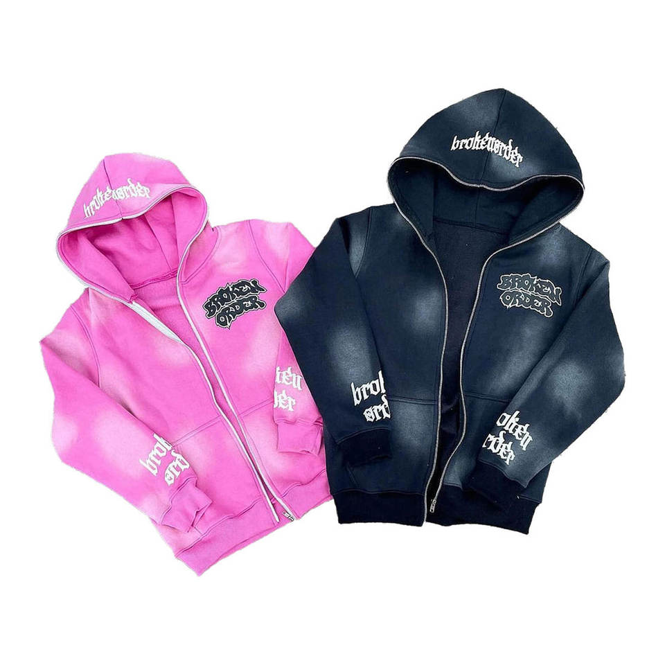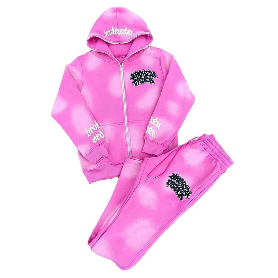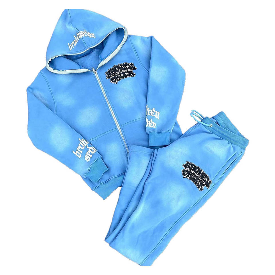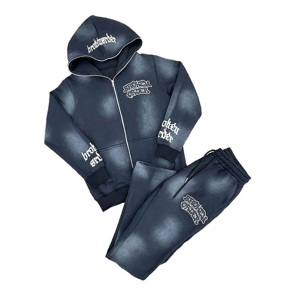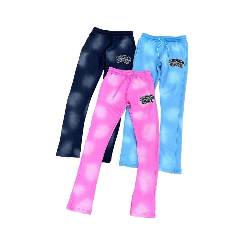 ชุดเซ็ตฮู้ดดี้และกางเกงวอร์มผ้าฝ้าย 100% ปักลายแบบดิสเทรส ทรงสเวตแพนท์ขาบาน