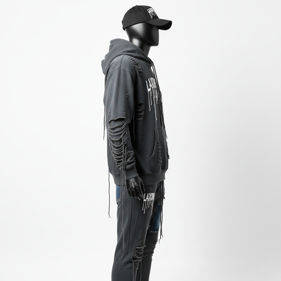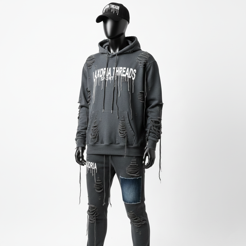 Distressed Embroidery Patch Men's Sweatsuit Zip up Hoodie Flared Pants Tracksuit Unisex Acid Washed Sweatpants and Hoodie Set