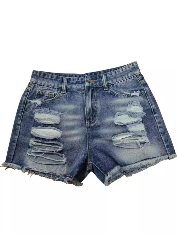 กางเกงขาสั้นผ้ายีนส์เอวสูงแบบวินเทจสำหรับผู้หญิงที่ชอบซักได้มีกระดุมติดพู่มีรูสำหรับฤดูร้อนและกระเป๋าที่ต่อกัน