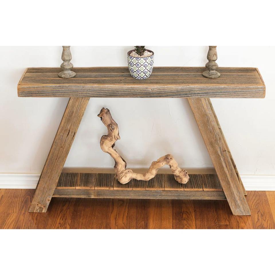 โต๊ะโซฟาเหล็กสไตล์โมเดิร์นแบบดิสเทรส พร้อมชั้นวางด้านล่างแบบเปิด โครงขาตั้งแบบ Trestle เหมาะสำหรับห้องนั่งเล่น โรงแรม และใช้เป็นแท่นโชว์