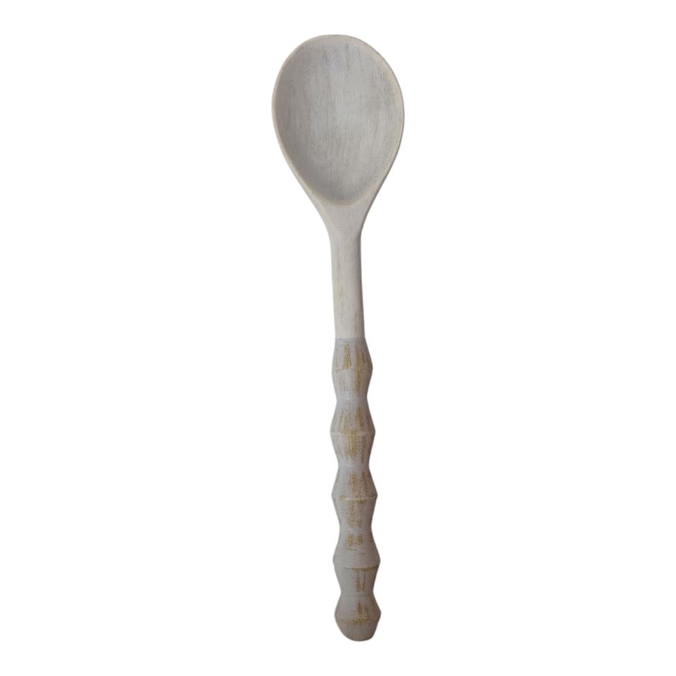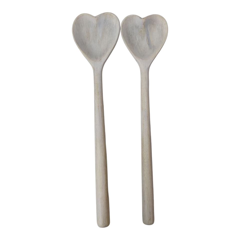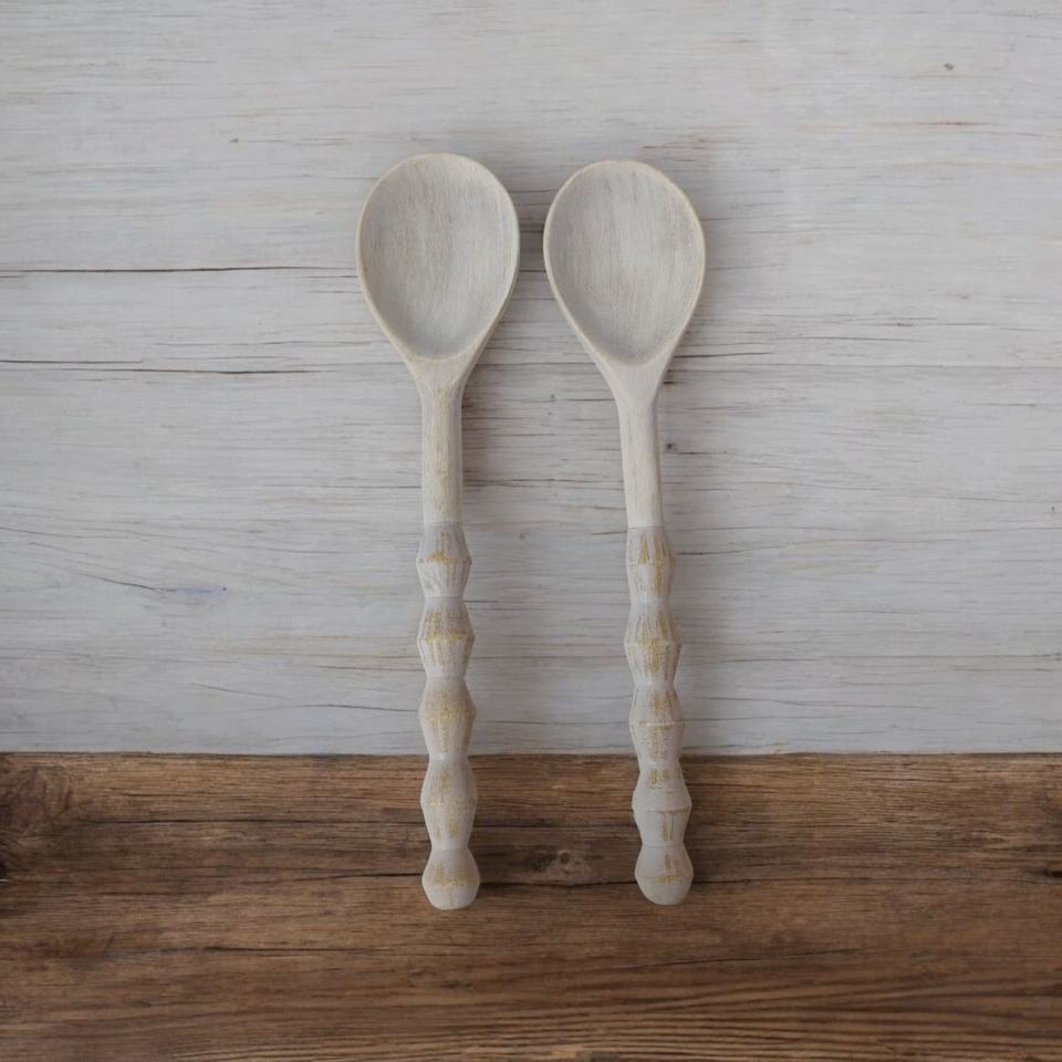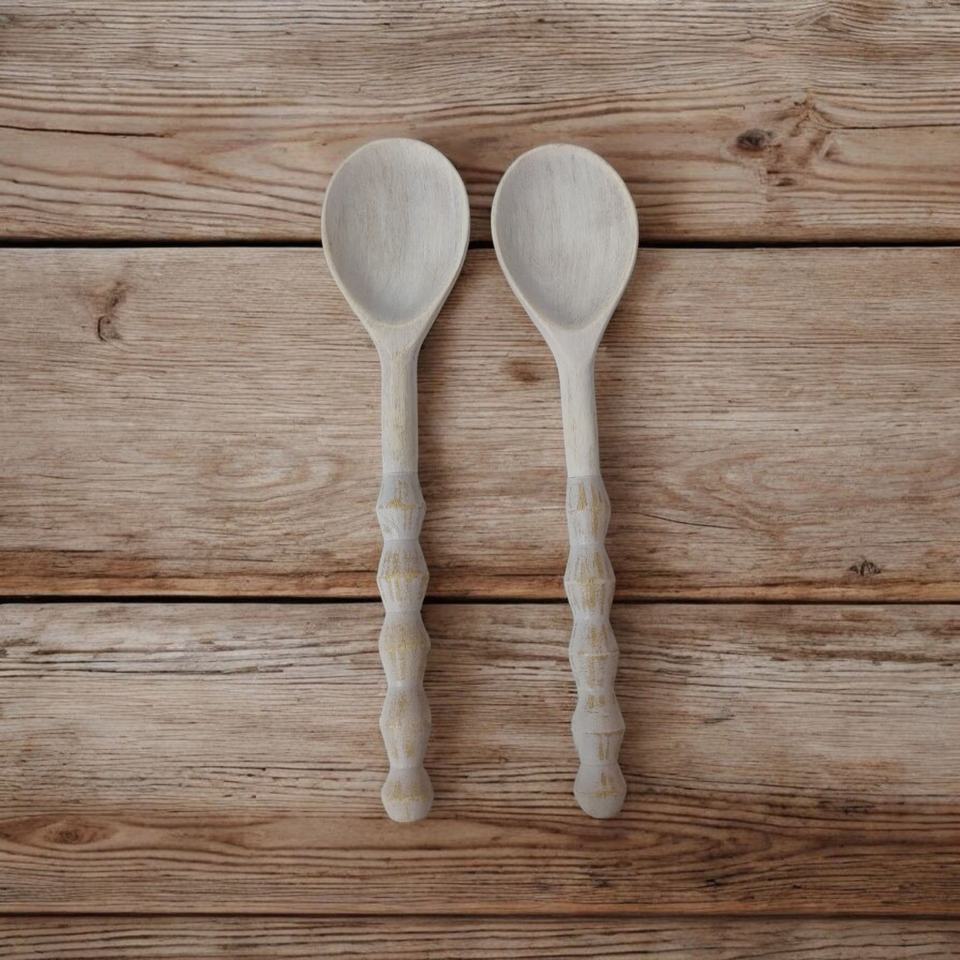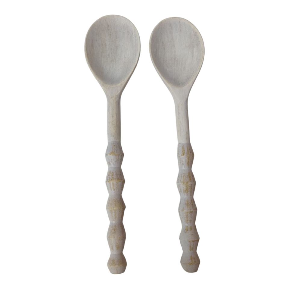 Distressed Utensils Elongated Set of 2 Hand-Carved White-Washed Mango Wood Home Kitchen Table Decor Serving Spoons Hotel Cutlery