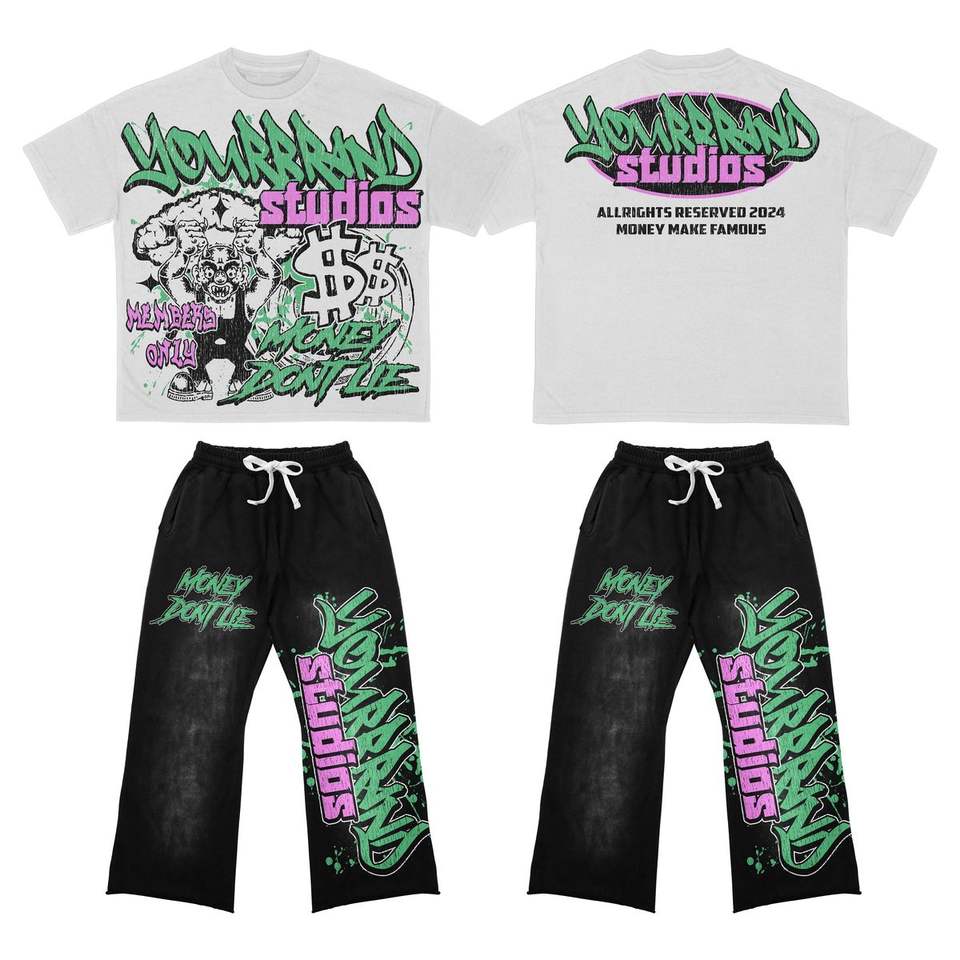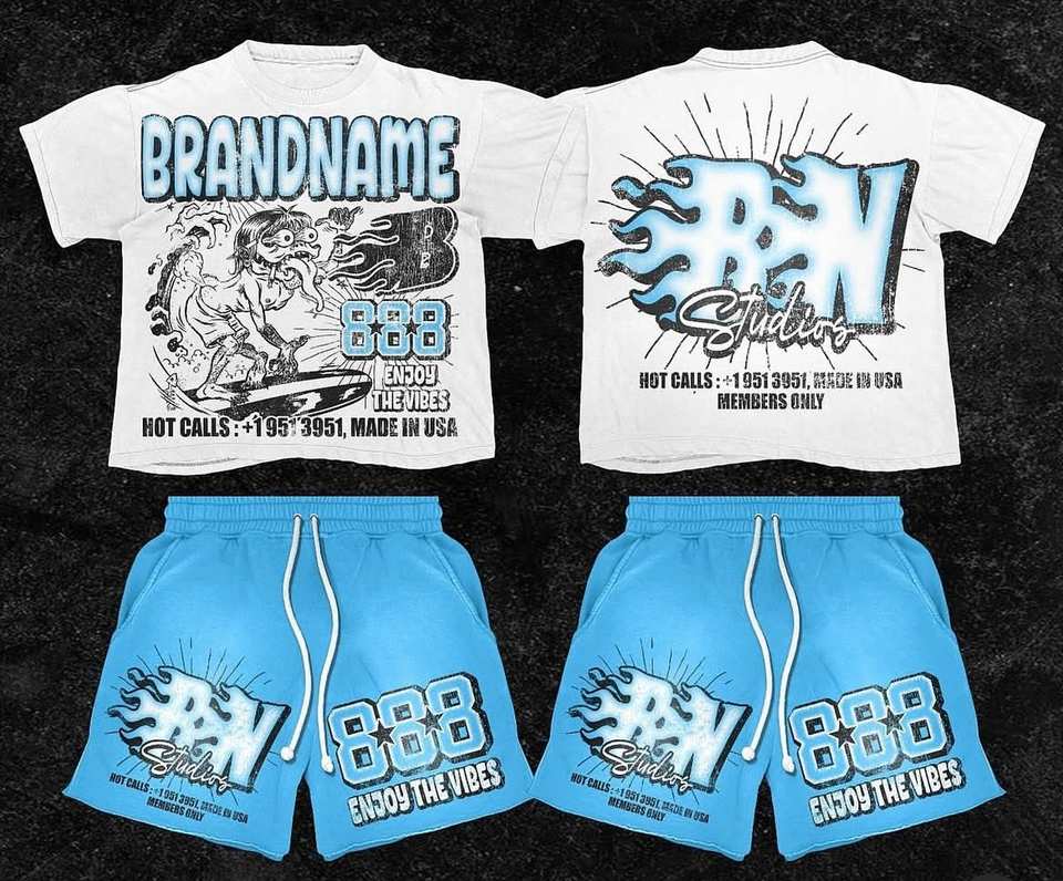 ชุดเสื้อยืดและกางเกงขาสั้นสไตล์วินเทจฟอกสีแบบทำเก่า พิมพ์ลายกราฟิกด้วยเทคนิค DTG ผ้าฝ้าย พร้อมเชือกผูกเอว