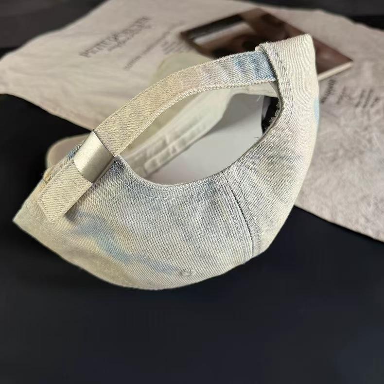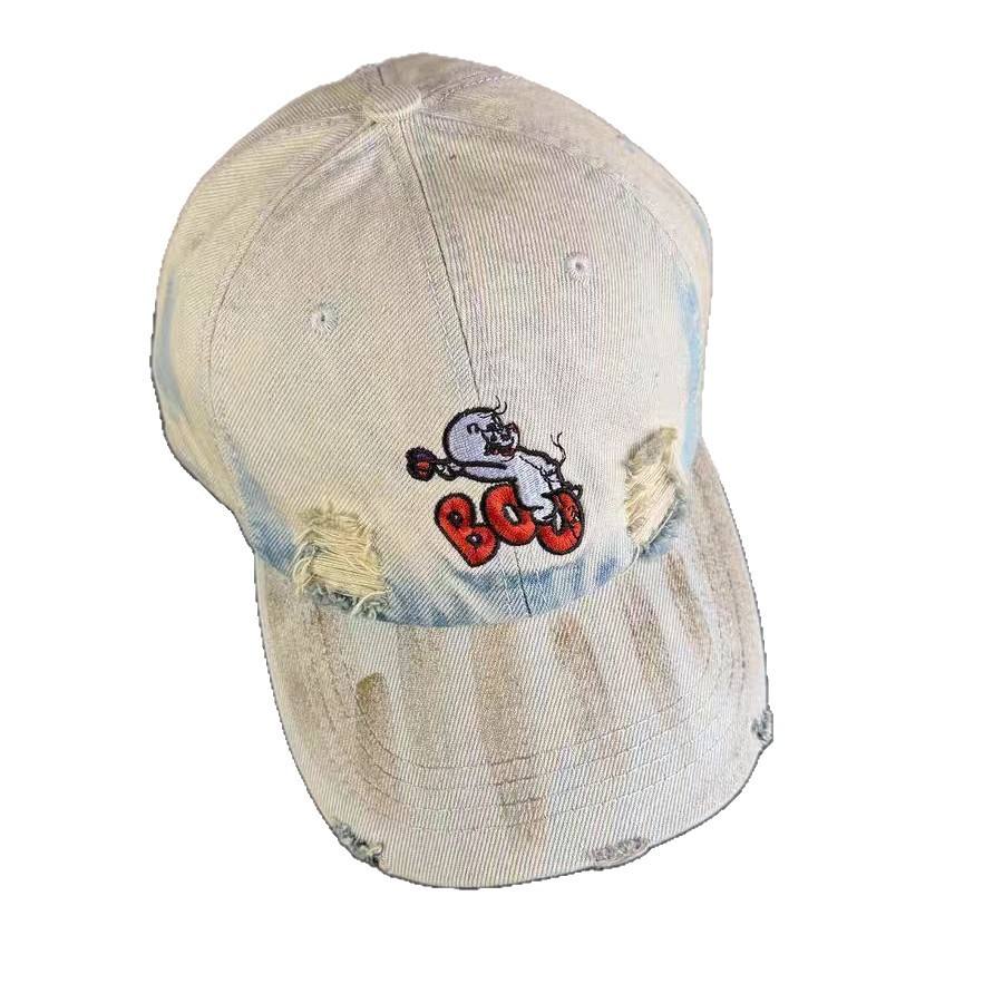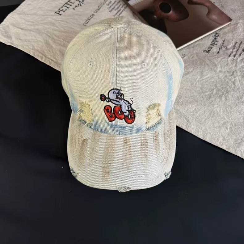 หมวกเบสบอลทรงดั๊กบิลผ้ายีนส์ PVC ปักลายการ์ตูนแบบไล่สีฟอกสีสไตล์วินเทจ