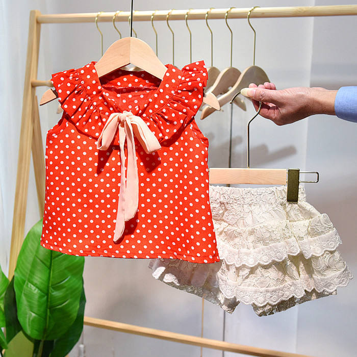 ผู้จัดจำหน่ายเสื้อผ้าเด็กผู้หญิงจากโรงงานจีน ชุดเสื้อยืดลายจุดสีส้มและกระโปรงมินิสั้นประดับลูกไม้