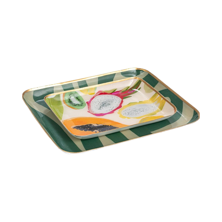 ชุดถาดโลหะเคลือบเงาลายผลไม้สร้างสรรค์จาก Diva Collections จำนวน 2 ชิ้น ทนทาน เป็นมิตรกับสิ่งแวดล้อม ใช้กับเครื่องล้างจานได้ เหมาะสำหรับใส่ของว่าง