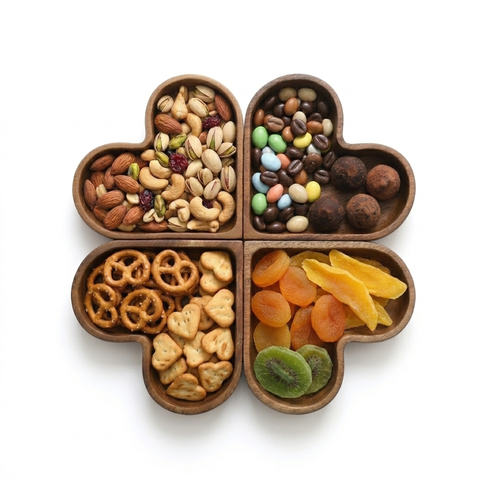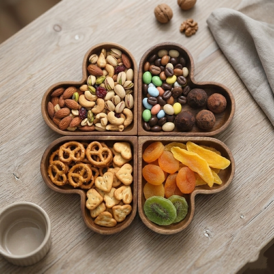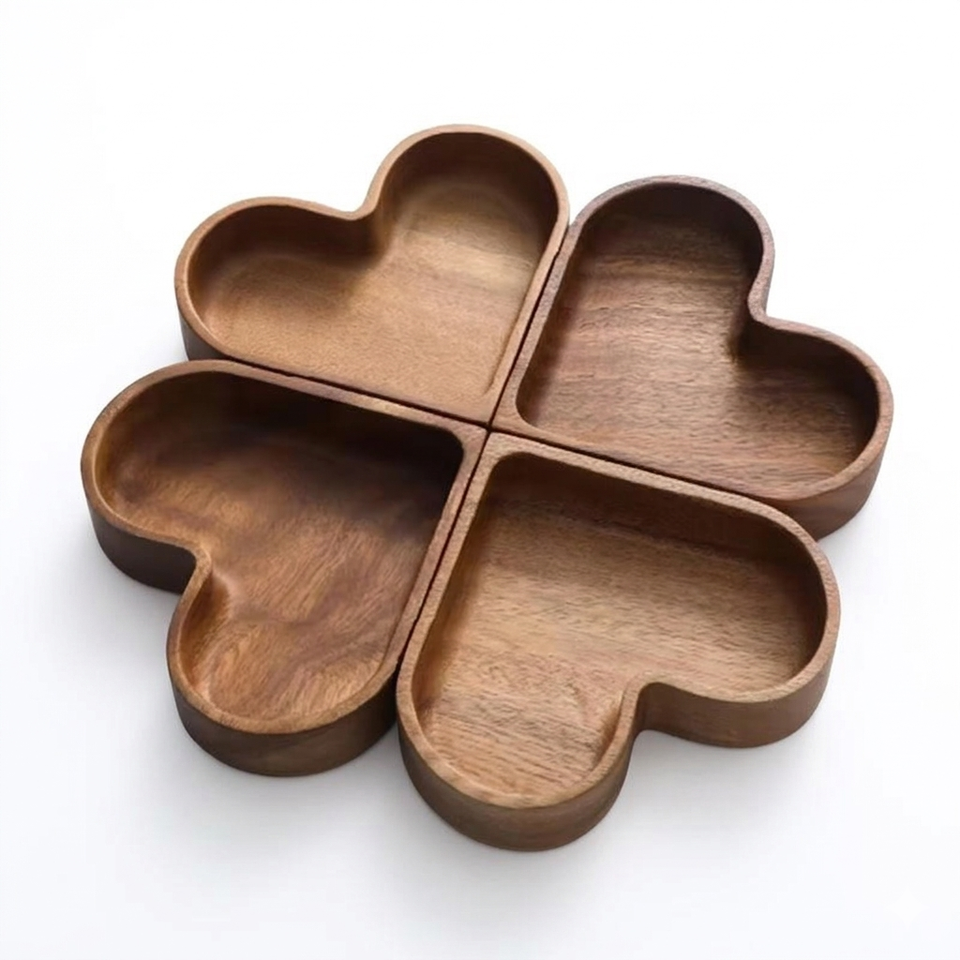 ถาดไม้แบ่งช่องใส่เครื่องปรุง 4 ช่อง รูปหัวใจ ถาดเสิร์ฟแบบยั่งยืนสำหรับถั่วและผลไม้อบแห้ง สุดหรู