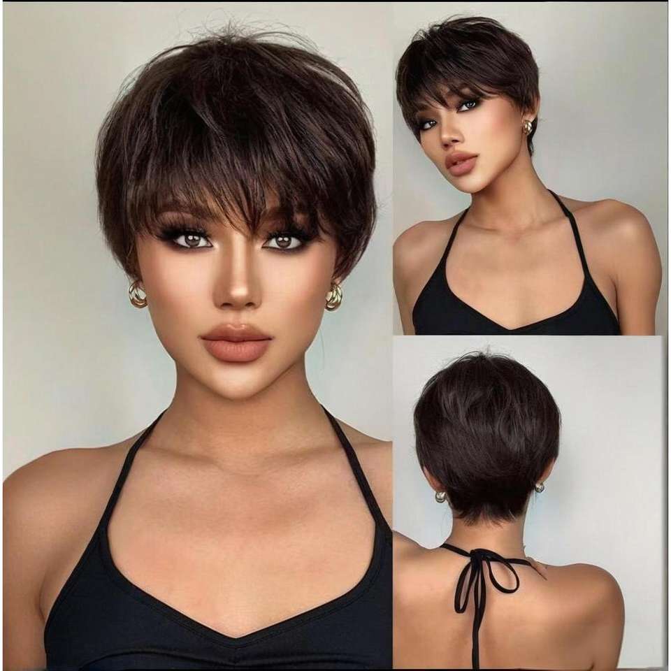 วิกผมสั้นตรงสำหรับผู้หญิง Dm29 15 สีน้ำตาลเข้ม-ดำ เส้นใยคาเนคาลอน แนวผมธรรมชาติ ฐานลูกไม้โปร่งใส วิกผมเต็มศีรษะ
