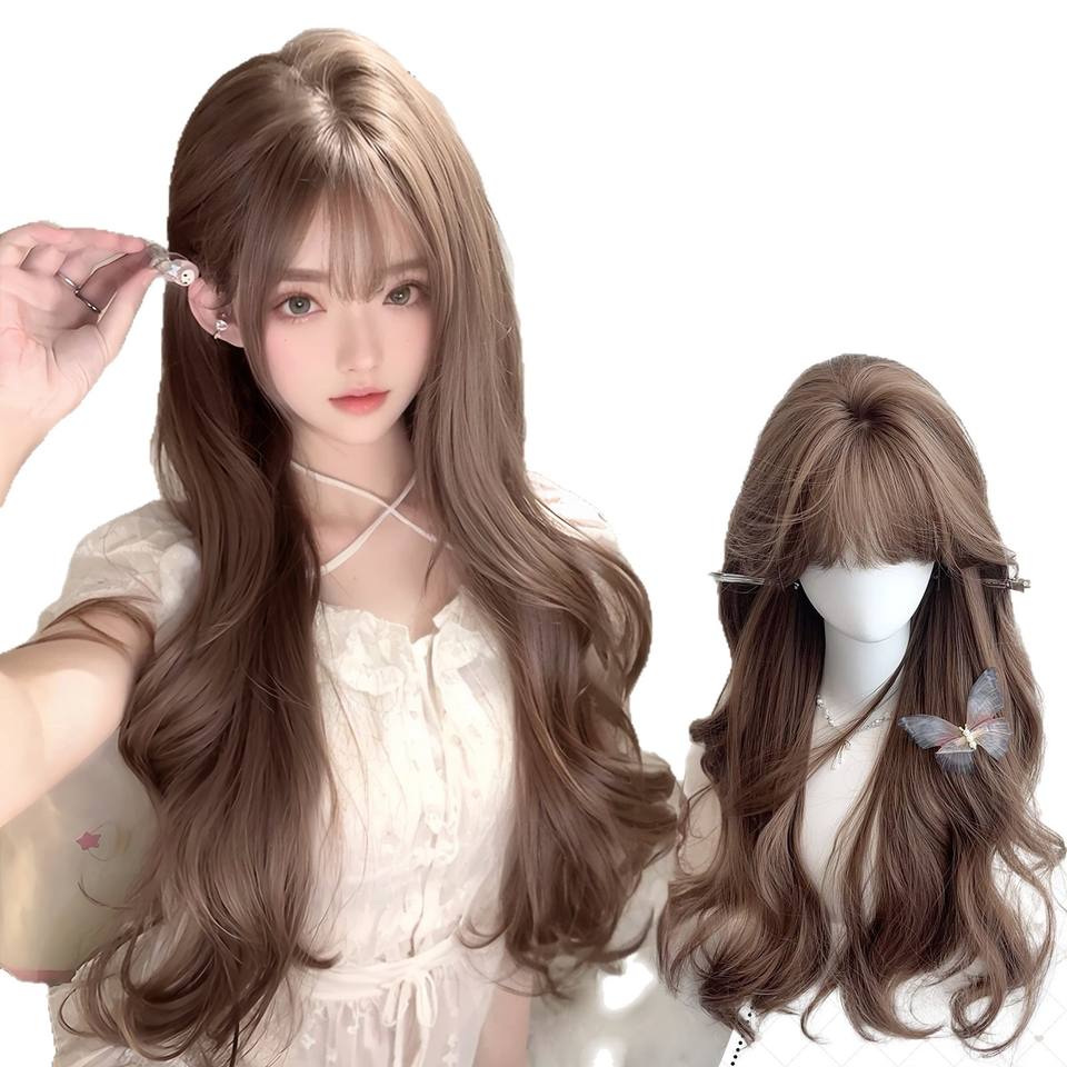 วิกผมยาวหยิกแบบ Dm773 23 สีน้ำผึ้งชาสีฟ้าอ่อน ไลน์ผมธรรมชาติ ปัดข้าง มีหน้าม้า วิกผมใยสังเคราะห์ Kanekalon สำหรับผู้หญิง