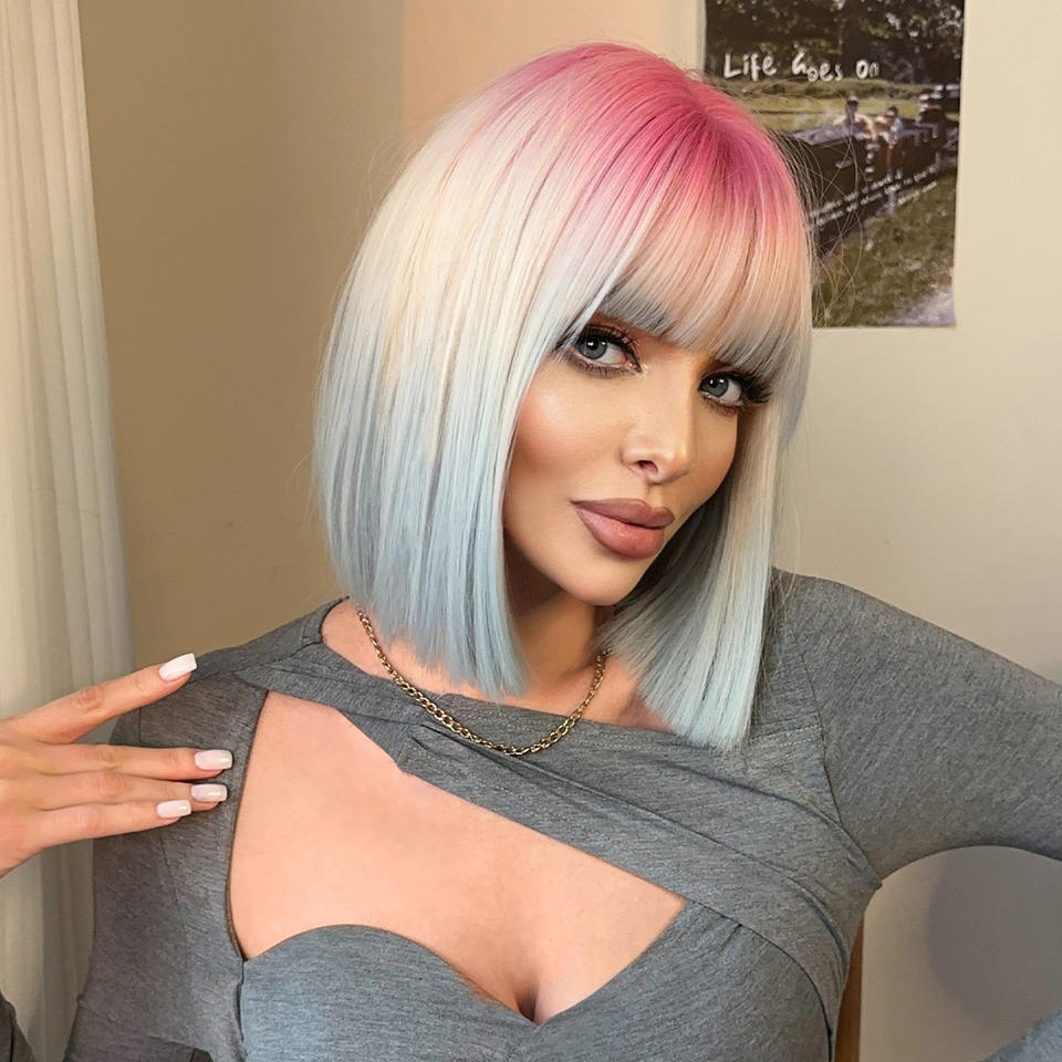 วิกผมตรงสั้น 30 ซม. รุ่น Dm877 สีฟ้าไล่เฉด ปิดผมเต็มศีรษะ ไร้รอยต่อ ดูเป็นธรรมชาติ วิกผมหน้าผากลูกไม้แบบมองไม่เห็น