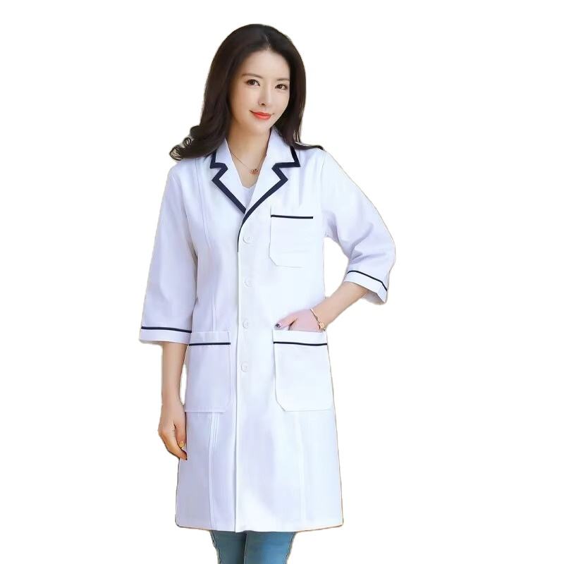 ชุดเครื่องแบบพยาบาลสำหรับทั้งชายและหญิงเสื้อโค้ทสำหรับทำแลปแบบยาวผ้าทอลายทแยงทำจากผ้าฝ้ายสีพื้นไม่ยับ