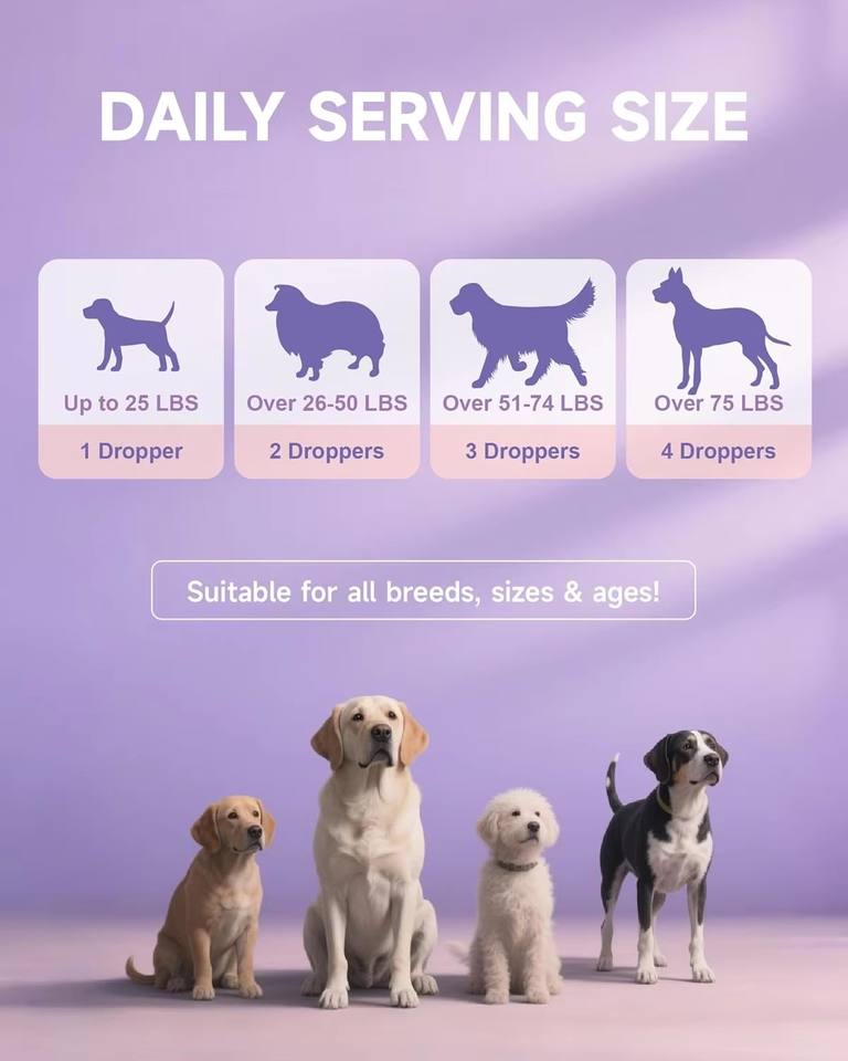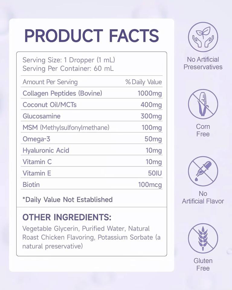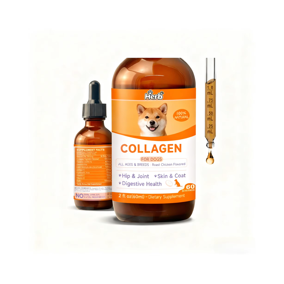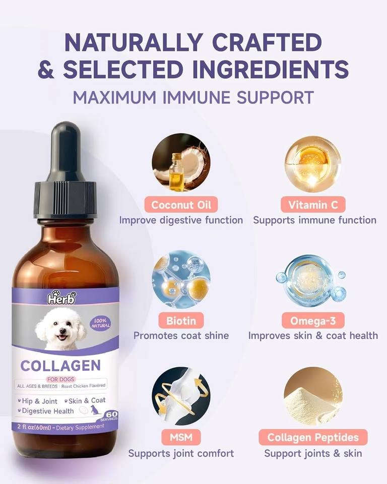 คอลลาเจนสำหรับสุนัขแบบหยด ไบโอติน MSM ขิง วิตามินซี อี ปราศจากธัญพืช อาหารเสริมออร์แกนิก 60 มล. บำรุงผิวหนัง ขน ข้อต่อ ระบบย่อยอาหาร และภูมิคุ้มกัน