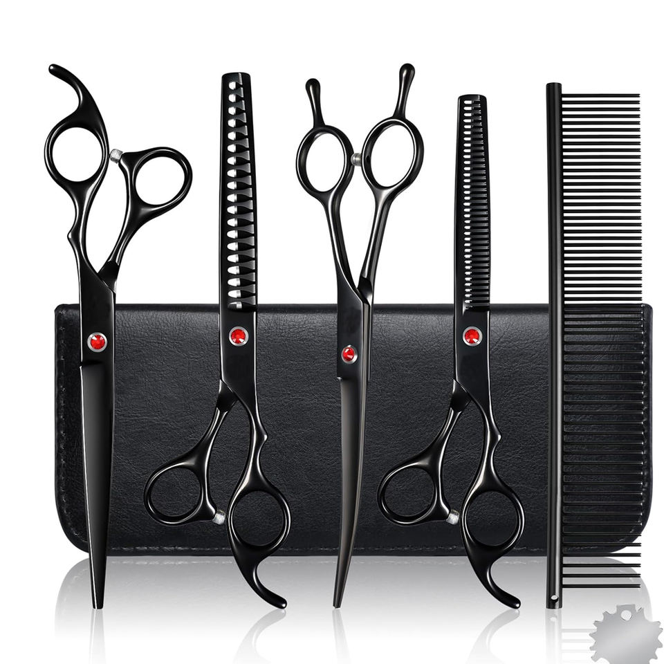 ชุดกรรไกรตัดขนสุนัขสแตนเลส - กรรไกรซอยตรงและโค้ง 7 นิ้ว สีดำ พร้อมสกรูปรับระดับ