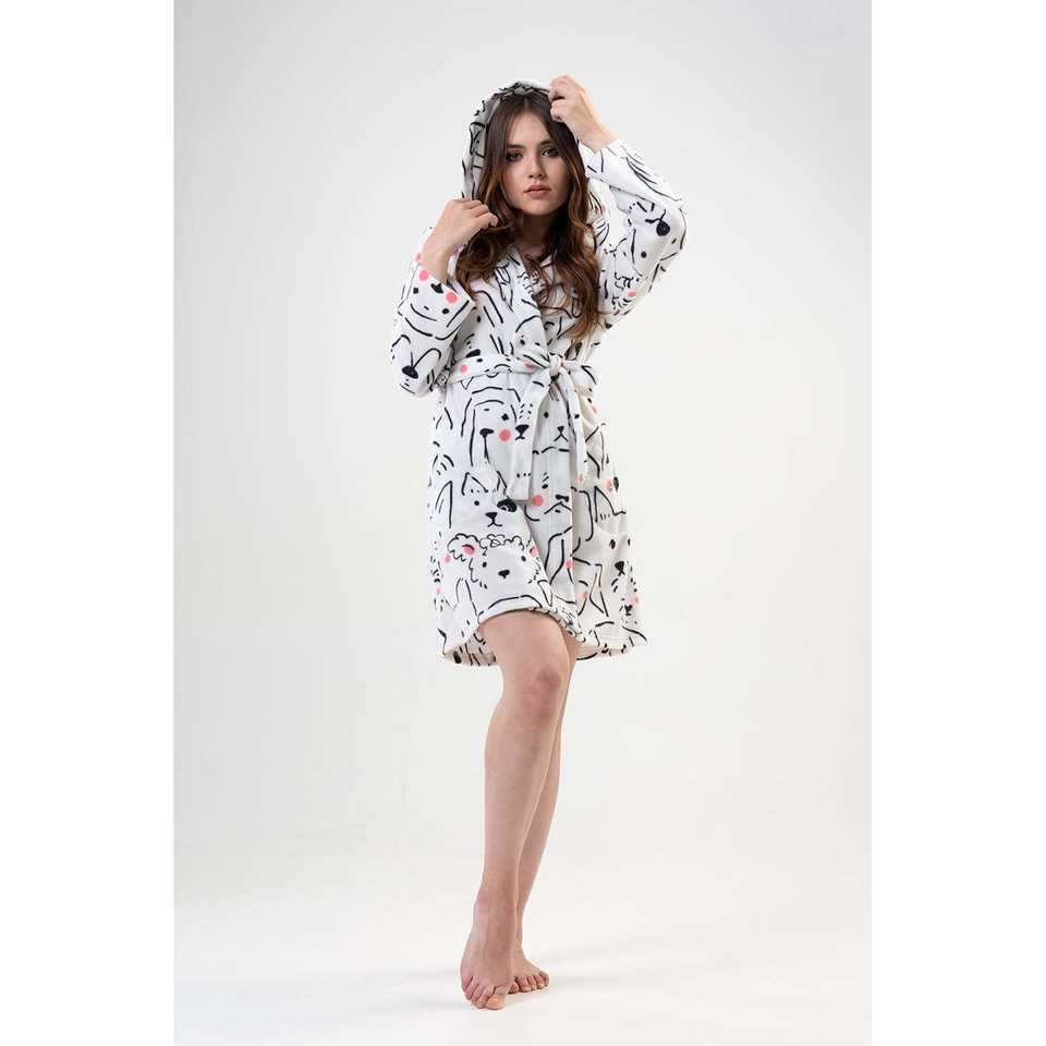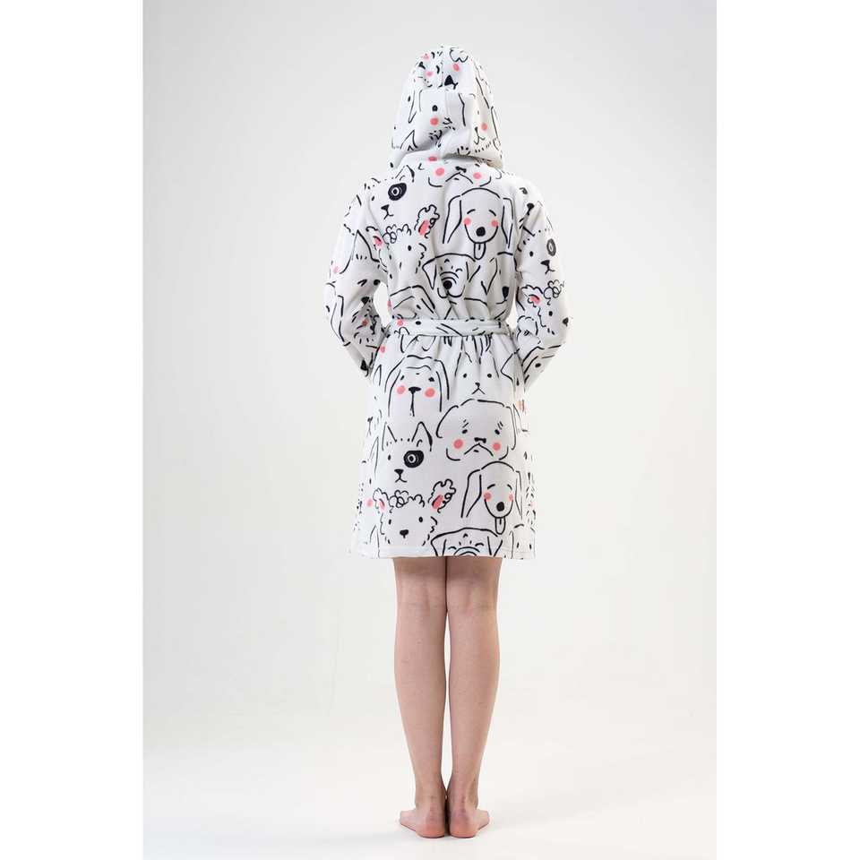เสื้อคลุมขนแกะพิมพ์ลายสุนัขผู้หญิงมีฮู้ดแขนยาวเสื้อคลุมอาบน้ำนุ่มสบายชุดนอนลำลองสีขาว