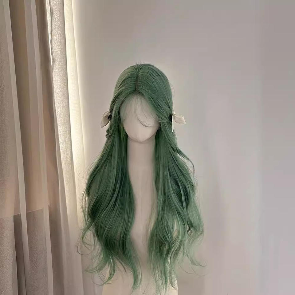 วิกผมยาวหยิกสีเขียวอ่อน 60 ซม. แสกกลาง ปิดผมได้ทั้งศีรษะ เส้นผมธรรมชาติ เส้นใยคาเนคาลอน