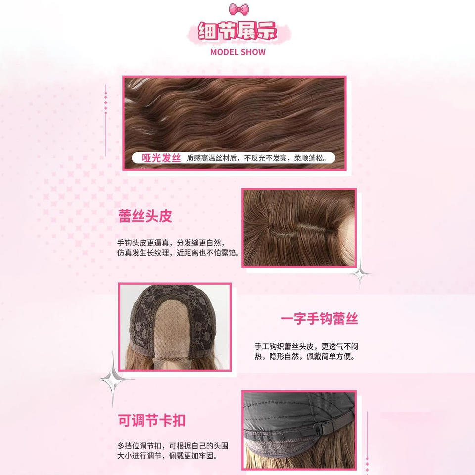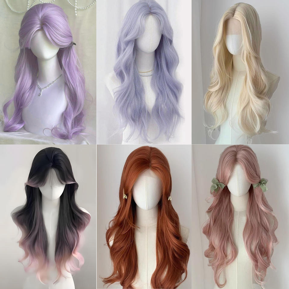 วิกผมยาวหยิกแบบติดกาวเต็มศีรษะ ยี่ห้อในประเทศ พร้อมหน้าม้าปัดข้าง ไฮไลท์ไล่เฉดสี พร้อมลูกผมด้านหน้า ทำจากเส้นใยทนความร้อนสูง