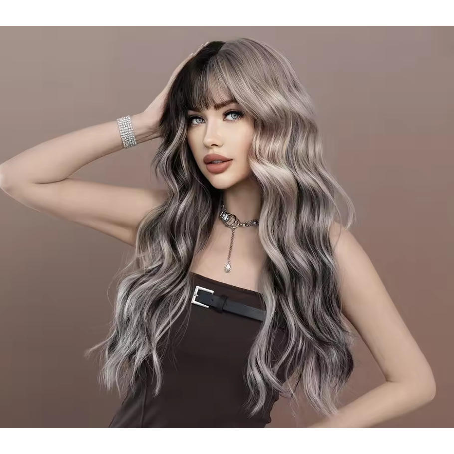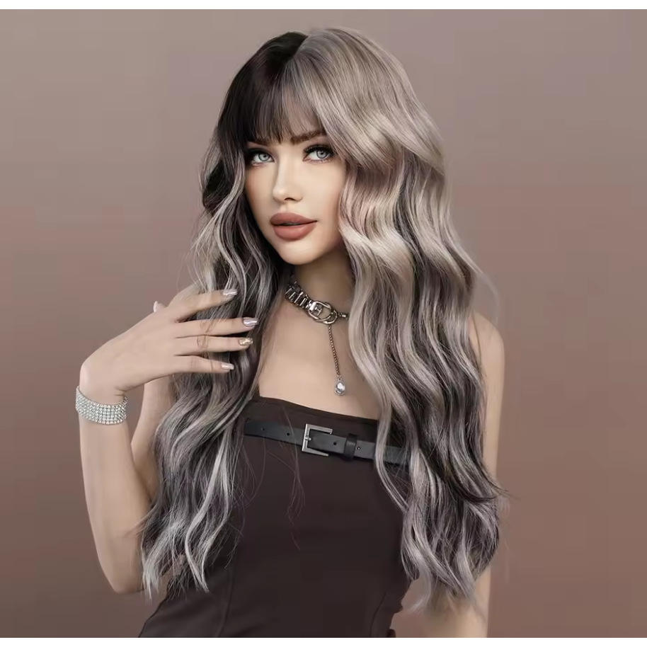 วิกผมยาวหยิกแบบแบรนด์ในประเทศ พร้อมหน้าม้าปัดข้าง สีดำ ขาว น้ำตาลทอง เส้นผมทนความร้อนสูง แนวไรผมธรรมชาติ