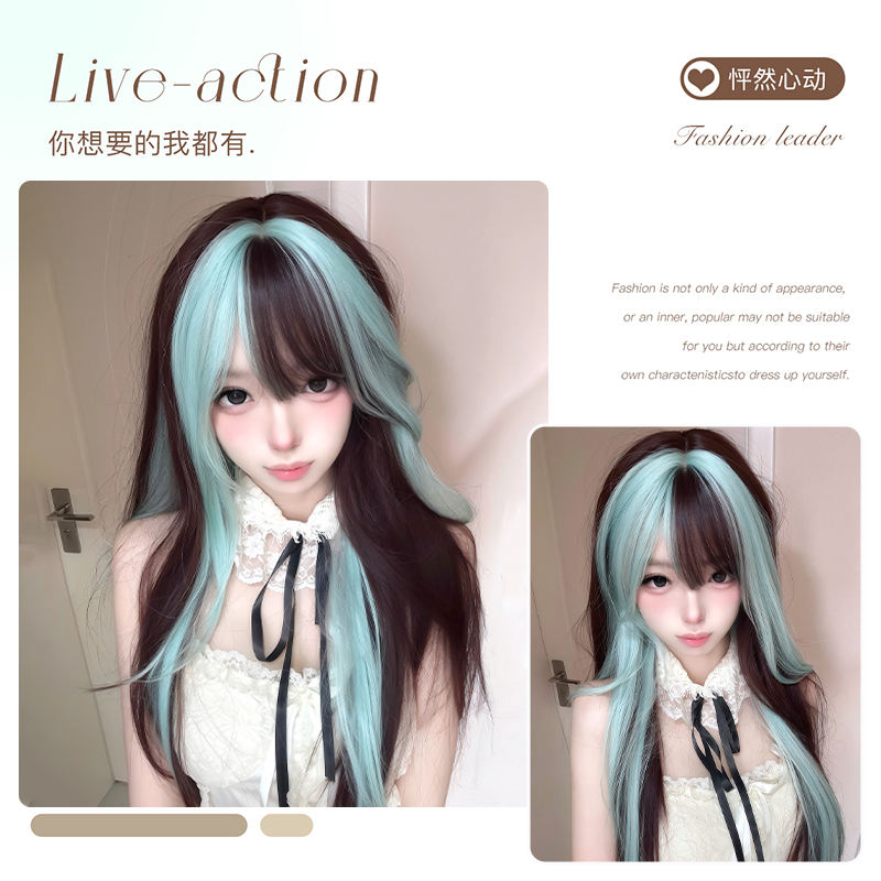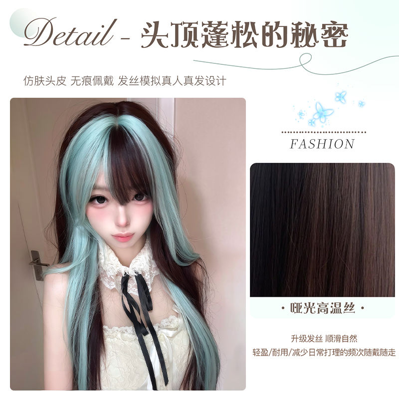 วิกผมตรงยาวแบรนด์ในประเทศ สีเขียวมิ้นท์ ไฮไลท์สีน้ำตาล ปอยผมปัดข้าง แนวผมธรรมชาติ วิกผมลูกไม้ด้านหน้า สำหรับสไตล์โลลิต้า