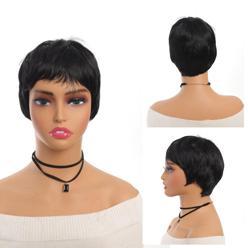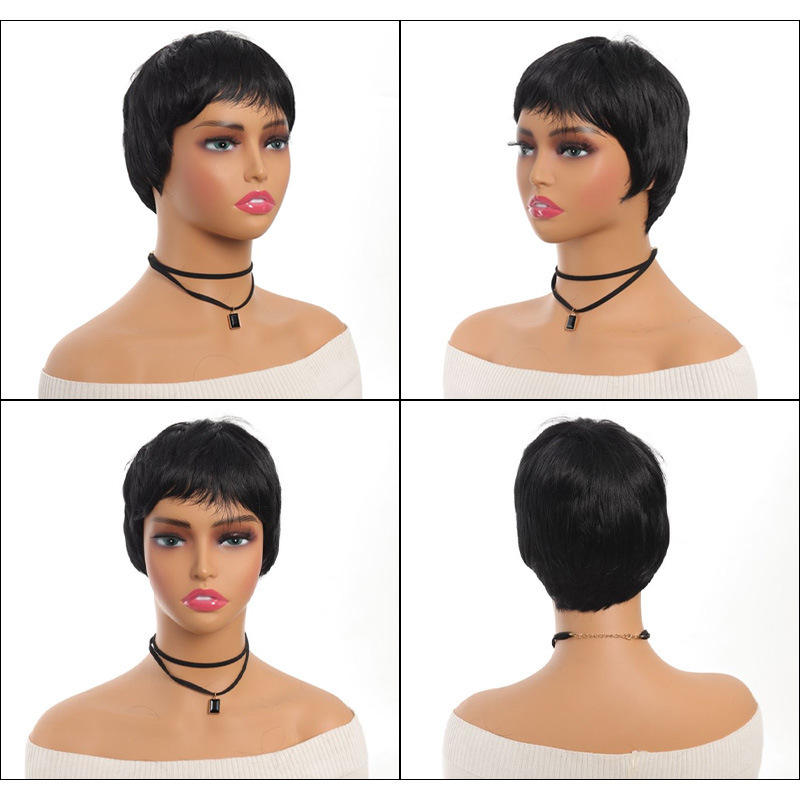 วิกผมสั้นตรง ยี่ห้อในประเทศ สี 1B เส้นใยคาเนคาลอน วิกผมสังเคราะห์แบบไม่ต้องใช้กาว สำหรับผู้หญิง สวมใส่ได้ทุกวัน