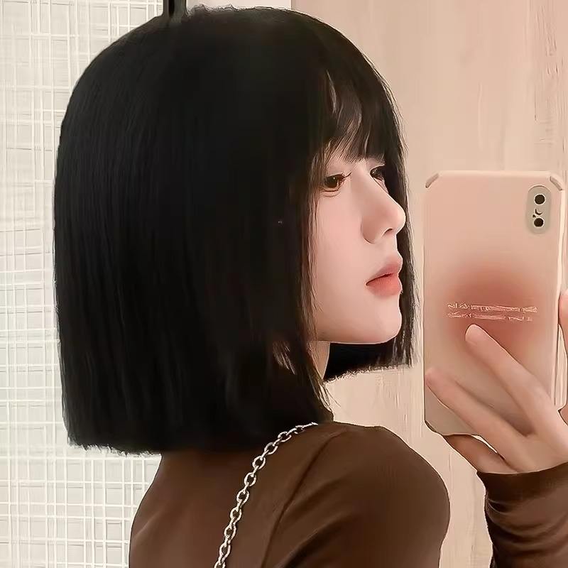 วิกผมบ๊อบสำหรับผู้หญิง ยี่ห้อในประเทศ ขนาด 30 ซม. สีน้ำตาลดำ เส้นใยคาเนคาลอน แบบเต็มศีรษะ มีหน้าม้า ไลน์ผมธรรมชาติ วิกผมสั้นตรง