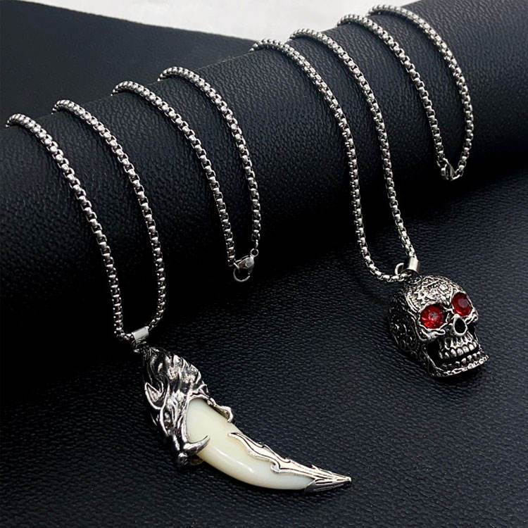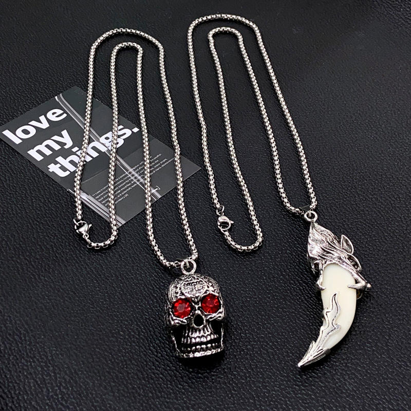 สร้อยคอจี้รูปฟันหมาป่า ขับไล่ภูตผี สำหรับผู้ชาย สไตล์พังก์ ทำจากสแตนเลส ประดับคริสตัลสีแดง รูปตาโครงกระดูก