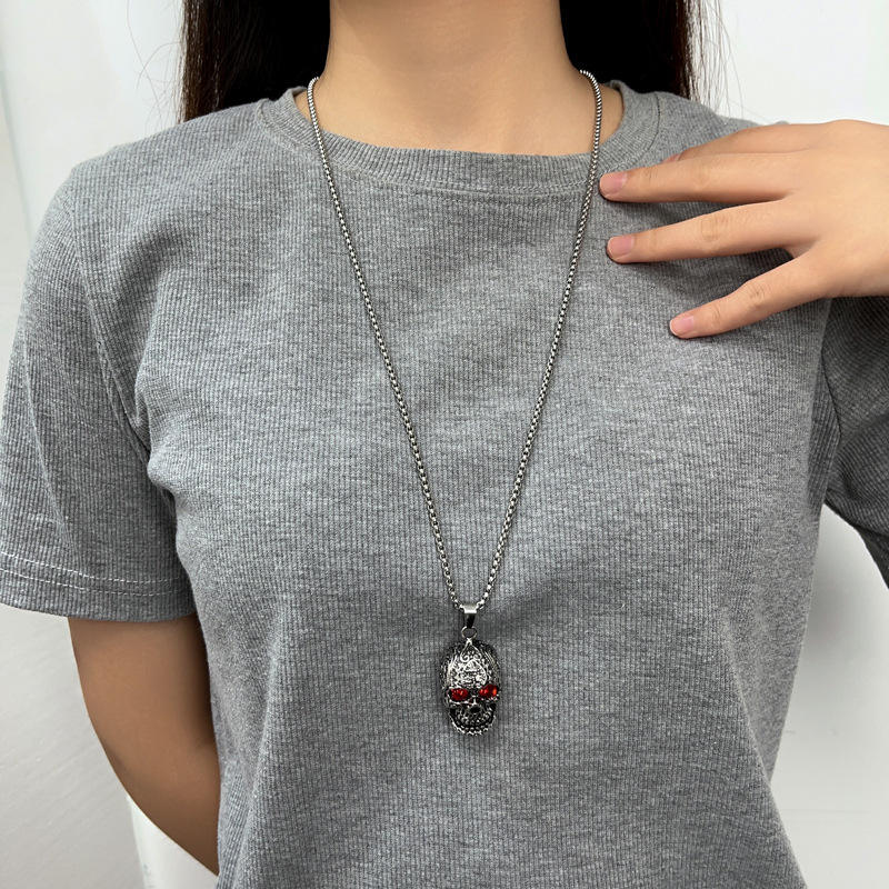 PUNK สร้อยคอสแตนเลสรูปหัวกะโหลกคริสตัลสีแดง