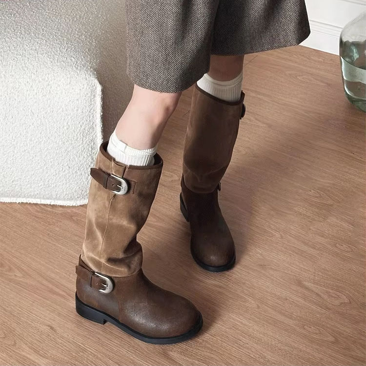 ดองเจี๋ยรองเท้าบูตยาวถึงเข่าของผู้หญิงแบบย้อนยุคลายพื้นรองเท้ากลางพื้นรองเท้าที่มีหัวเข็มขัดขนาดใหญ่และส้นหนาบางสไตล์เดียวกับอัศวิน