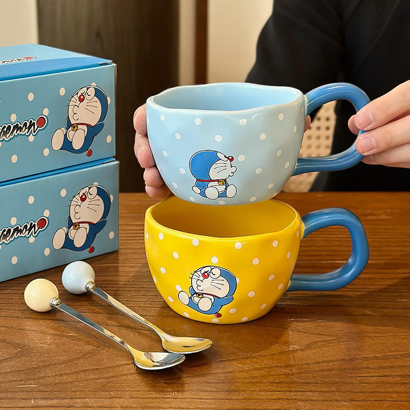 แก้วเซรามิกโดราเอมอน ลายจุดสีเหลือง พร้อมหูจับสีน้ำเงิน สำหรับใช้ในบ้านและสำนักงาน