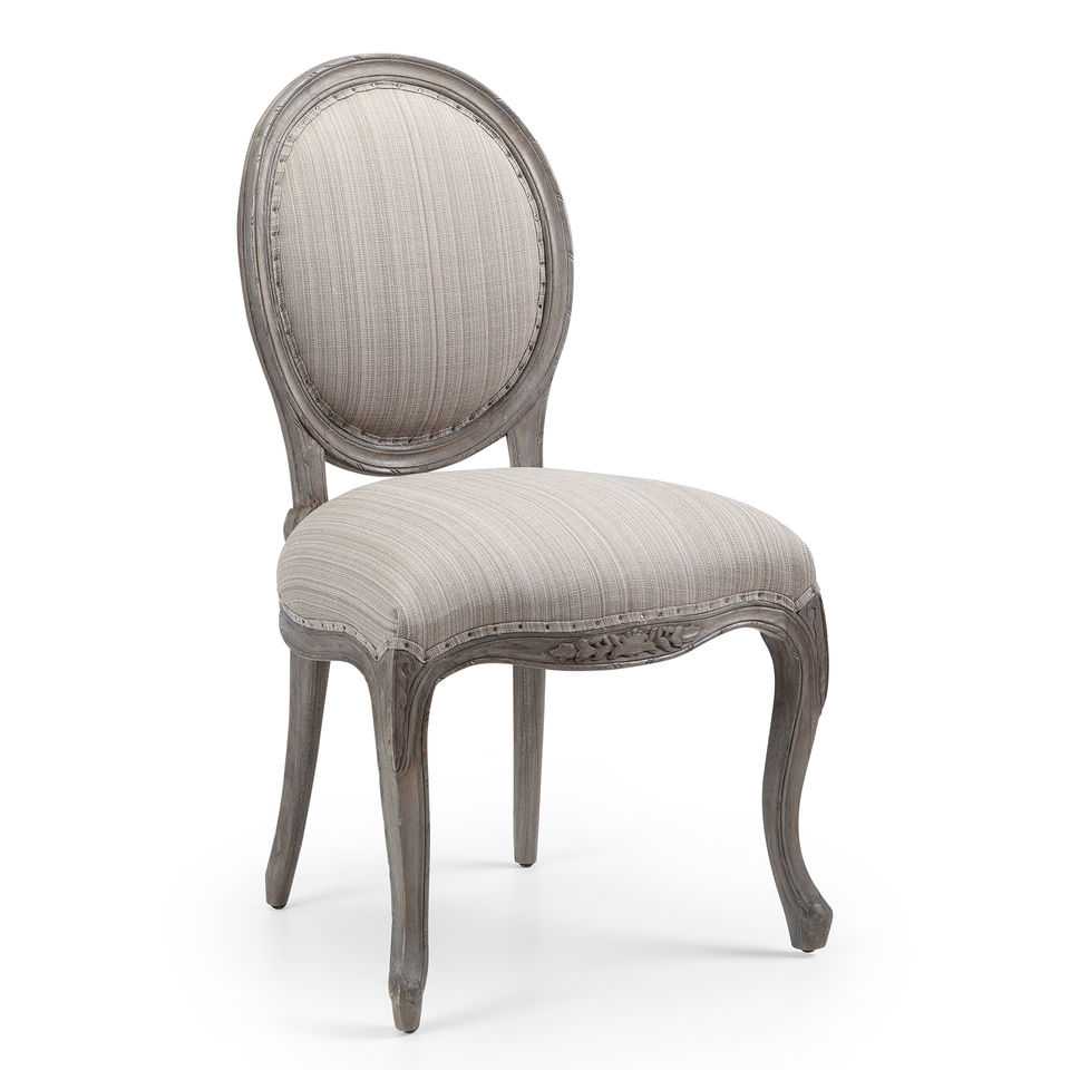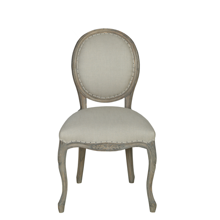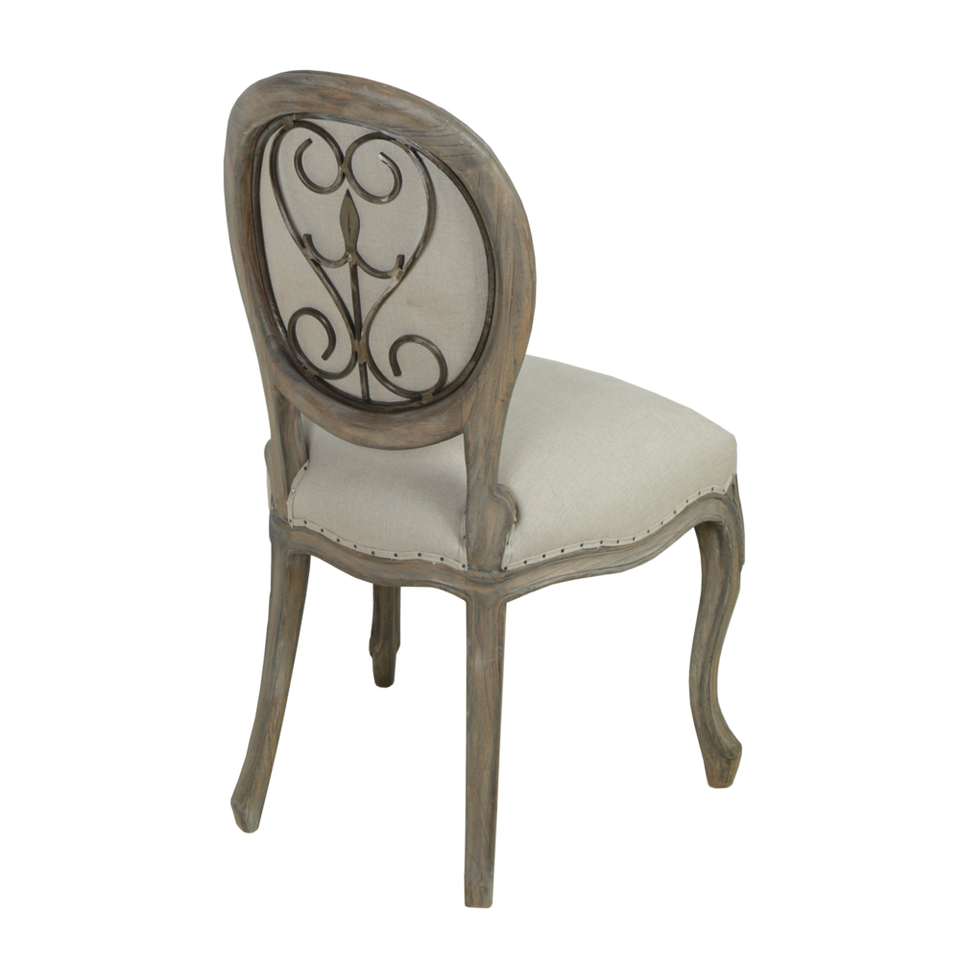 เก้าอี้รับประทานอาหารสไตล์ฝรั่งเศส รุ่นดอร์เซต ทำจากไม้สักแท้ คุณภาพสูง หุ้มด้วยผ้า และพนักพิงโลหะ สำหรับใช้ภายในอาคาร