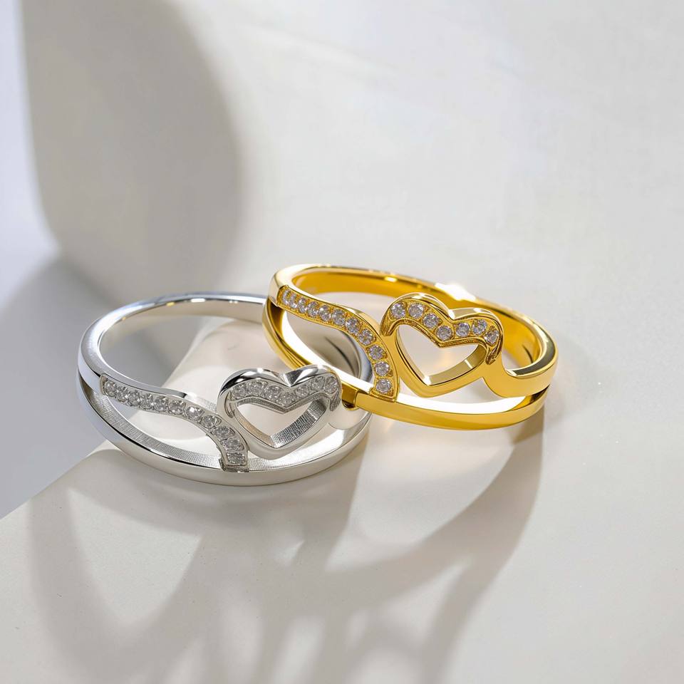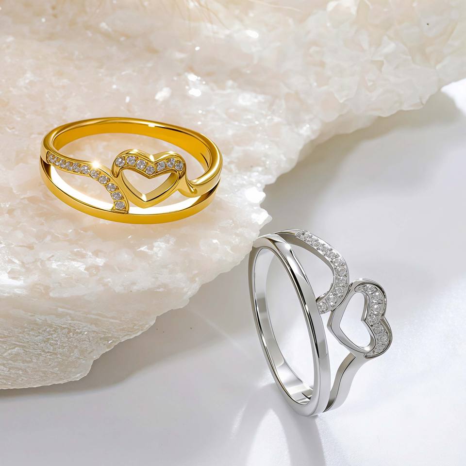 แหวนรูปหัวใจประดับเพชรเต็มวงแบบสองแถบ - วงแหวนรูปหัวใจแบบกลวง 3 มิติ ดีไซน์หรูหราเบาๆ สำหรับผู้หญิง เหมาะสำหรับใส่ไปทำงานและงานสังสรรค์